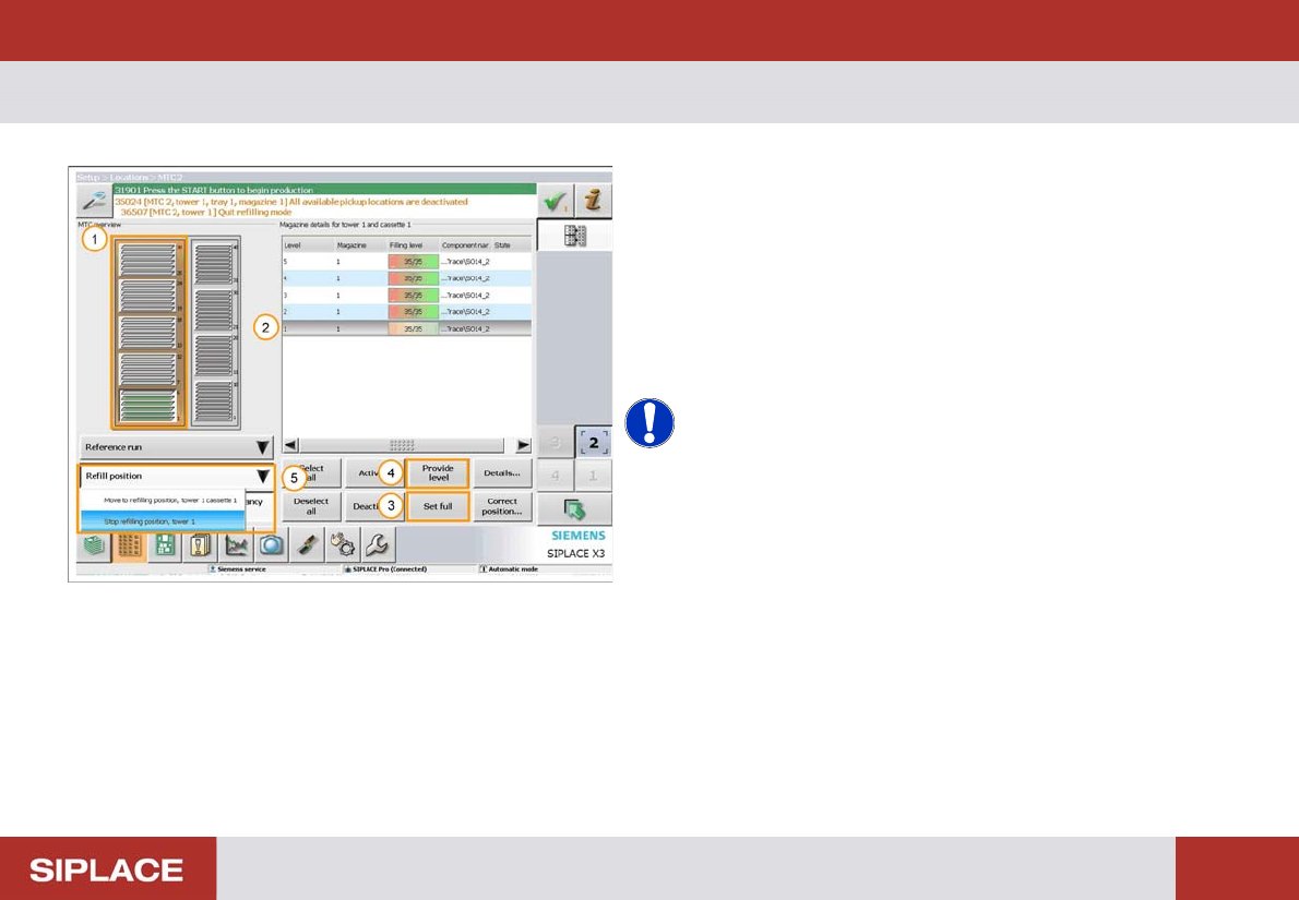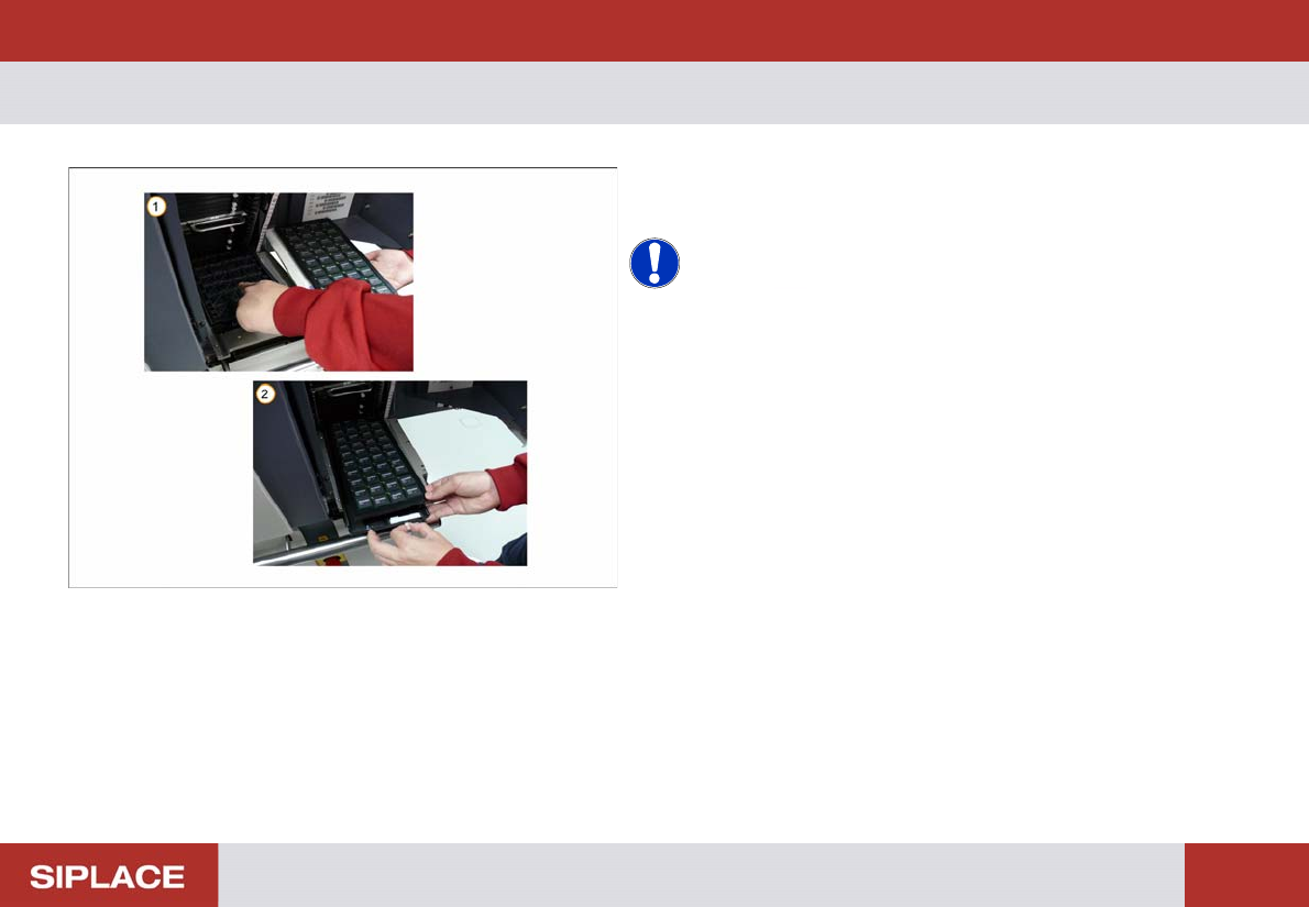 Option 703 MTC Refill - Loading the new tray. : 147 Loading t he new tray. 1. Remov e the empty t ray. 2. Load the new tray of com ponents. NOTICE! Ensure t hat the new tray of components is loaded in the correct orienta…