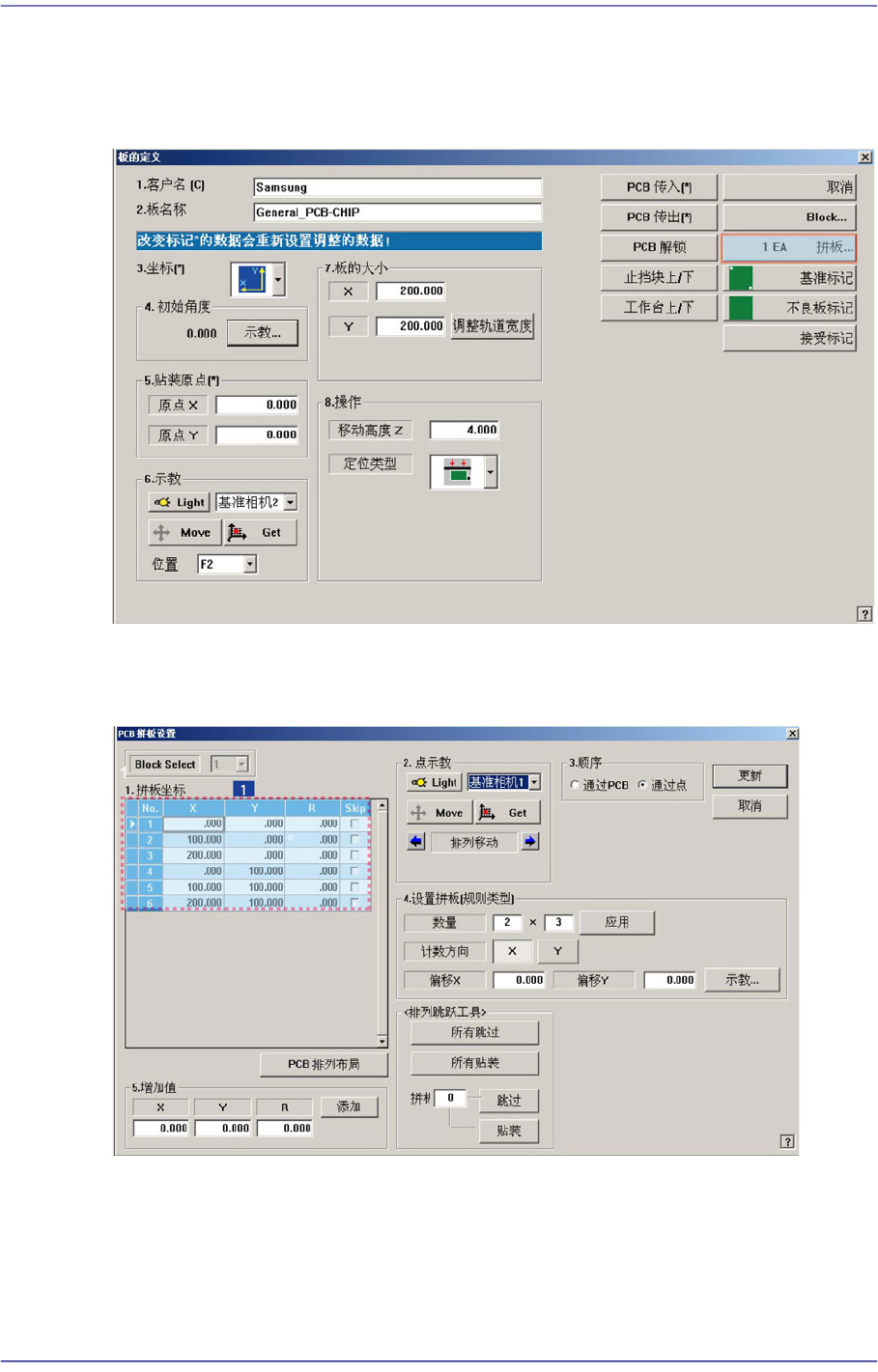 它执行把PCB安装在作业领域的功能。执行此功能之前,必须在<7. 操作>的”