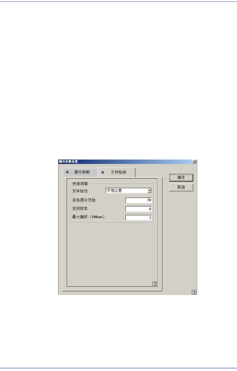 7-33 元件的登记 - 黑夜灯 要执行方向检验的 Body 比背景暗 时选择。 - 点亮 要执行方向检验的 Body 比背景亮 时选择。 < 实体得分开始 > 编辑 框 设置要执行方向检验 Body 的 Threshold 。 (0~100) < 实例样本 > 编辑框 设置要执行方向检验 Body 的 Sampling 程度。 (0~10, 0 : auto) < 最大偏移 ( 100um )…