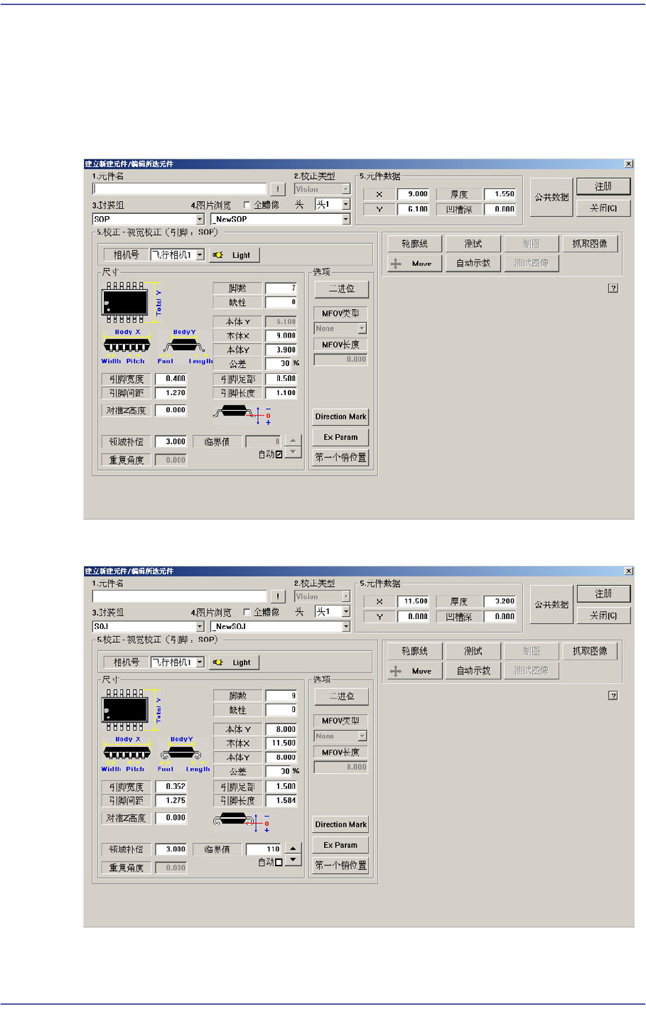 7-56 Next Generation, Multi-Function al Placer DECAN S1 Administrator’s Guide 图 7.20 “ 封装组 = SOP2” 时的对话框 图 7.21 “ 封装组 = SOJ2” 时的对话框 < 相机号 > 组合框 选择识别部品的摄象机。 详细事项请参照 “ 7.1.1 共同 Align Data ” 。 按钮 设定识别部品用摄象机的照明度。 详…