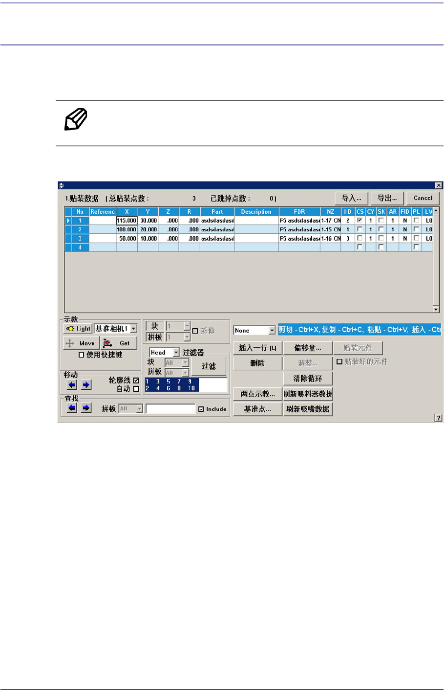 ‘贴装步骤’ 子菜单编辑有关PCB贴装点的位置,部品的基准点标记,要贴装的部