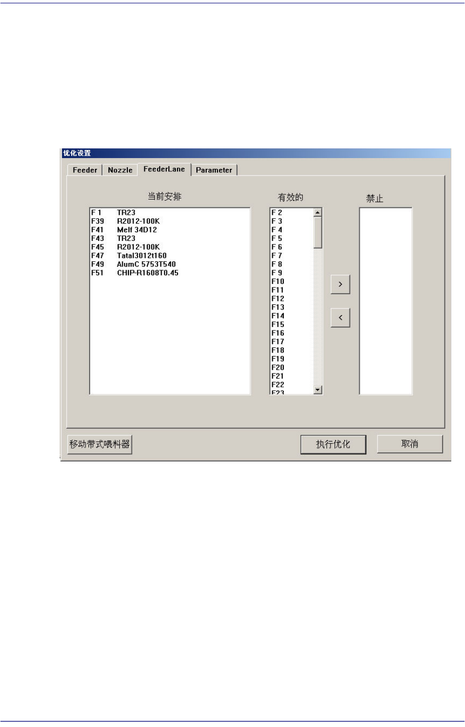 显示在<禁止布置 >目录框的喂料器底座插槽则optimizer不布置任何装置。点击