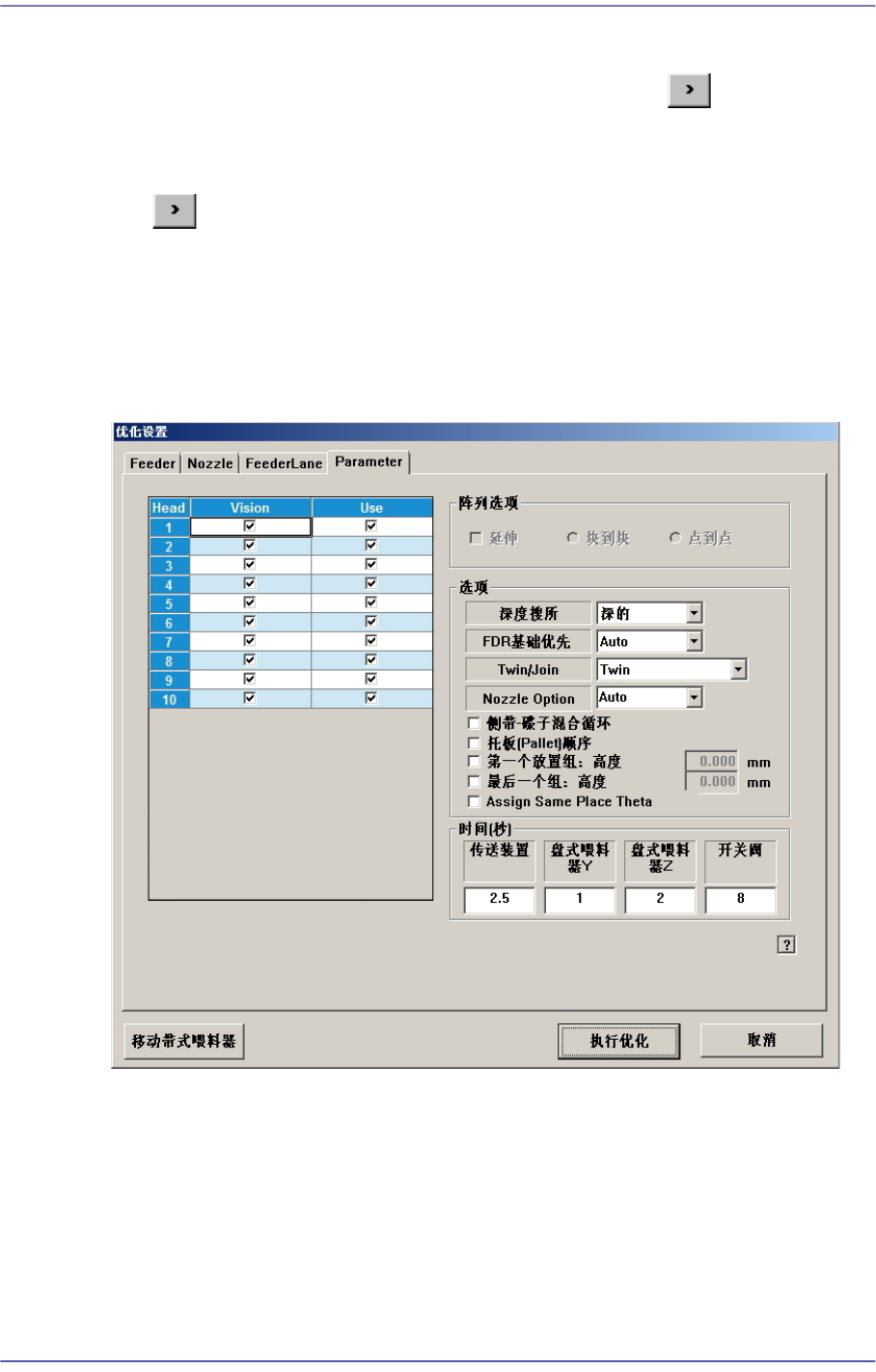 此对话框设定用于优化喂料器配置的 喂料器通道。配置在 喂料器通道的装置包括