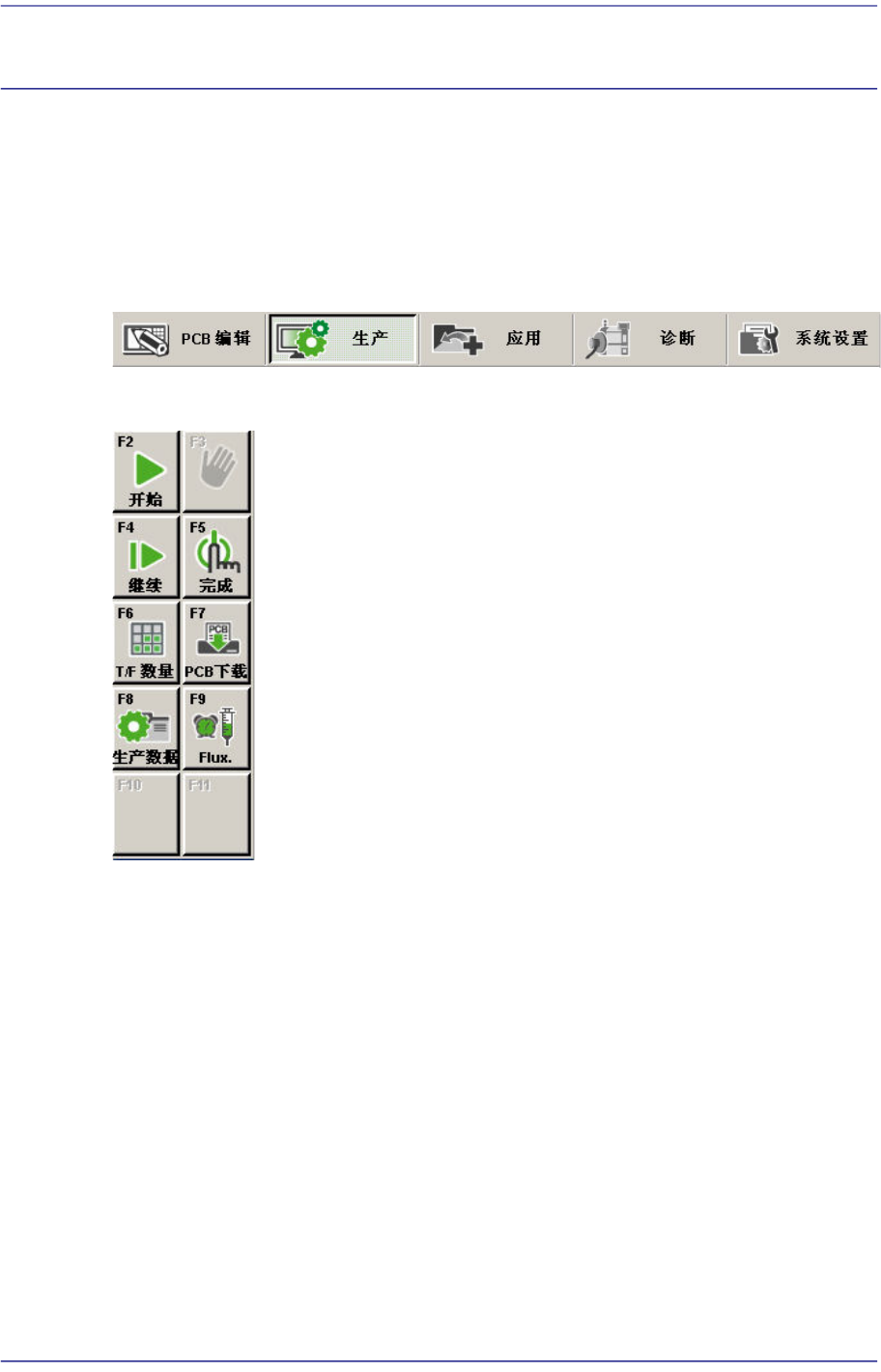 ‘生产’ 菜单由 开始, 停止, 继续生产, 完成, T/F 数量, PCB 下载, 生产数据 等7个子