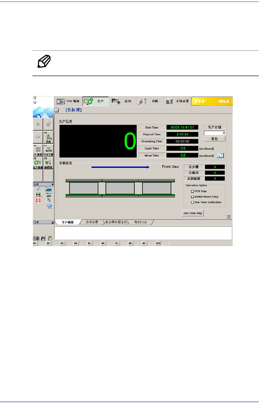 13-1 Production Setu p 第 13 章 . Production Setup ‘ 生产 ’ 菜单 由 开始 , 停止 , 继续生产 , 完成 , T/ F 数量 , PCB 下载 , 生产数据 等 7 个子 菜单组成。 此命令执行把 PCB (Printed Circuit Board) 的贴装作业显示在显示器 ( Monitorin g ) 的 功能。 图 13.1 选择 ‘ 生产 ’ 菜单的状态 图 13.2 ‘…