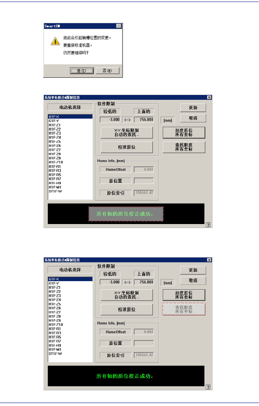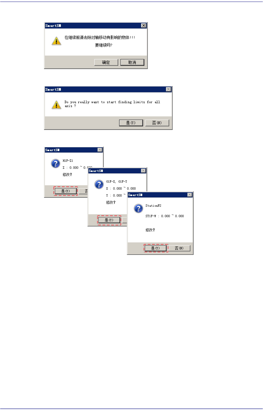 14-19 Machine Calibration 5. 确认设备内部或 Conveyor 上是否有 物 体后, 点击 < 确认 > 按钮。 6. 点击 < 是 > 按钮。 7. 按轴测量 Limit 值 。 点击 < 是 > 按 钮。