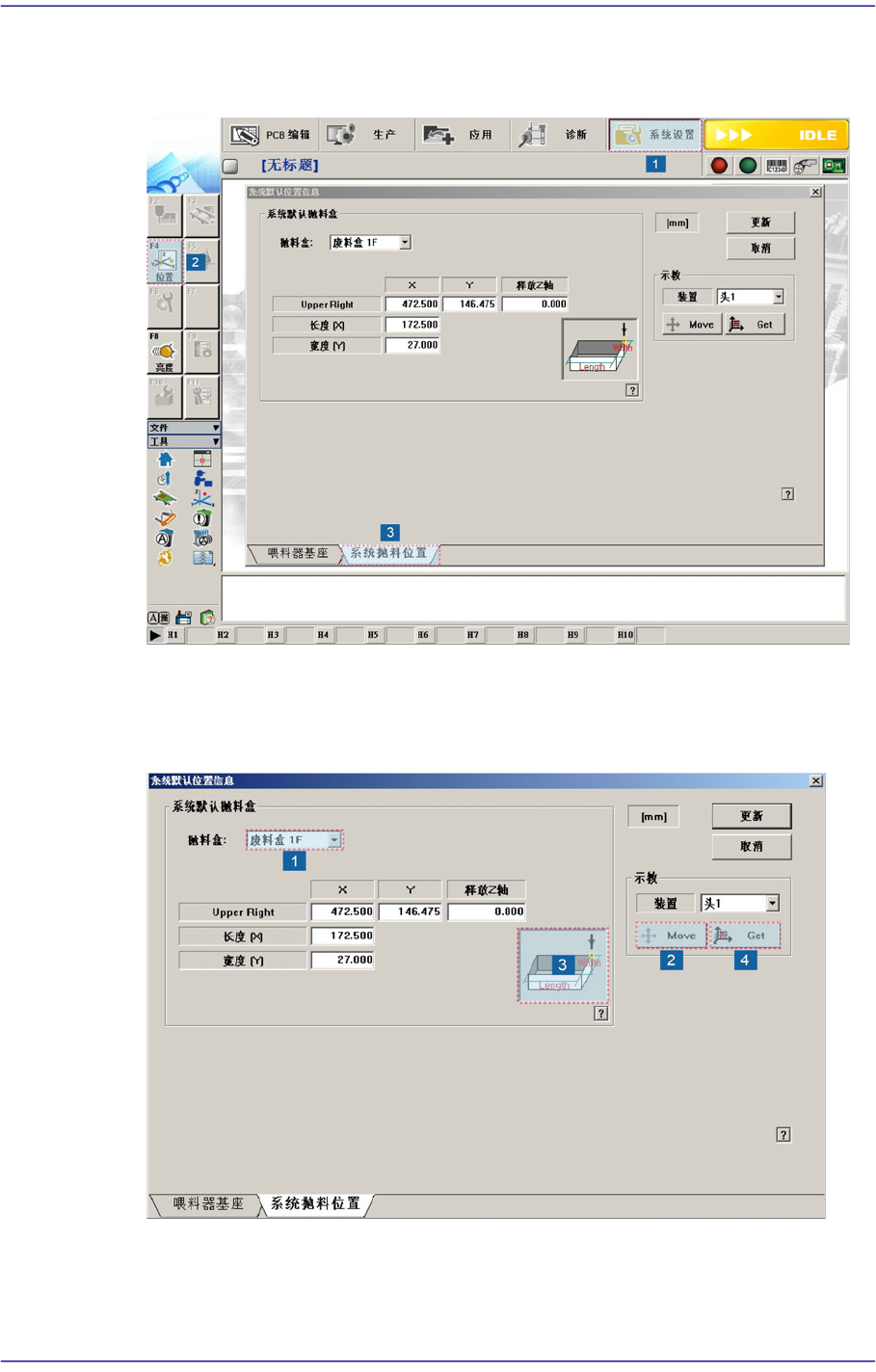 15-12 Next Generation, Multi-Function al Placer DECAN S1 Administrator’s Guide 4. 在 <Dump Box> 组合框选 择 Dump Box 1R 后, 移动到下图的 3 号位置。 然后单击 <Get> 按钮进行坐标示教。 5. Dump Box 2R 也使用 Dump Bo x 1R 的同一方 法 进行坐标示教。 下面是 Air S…