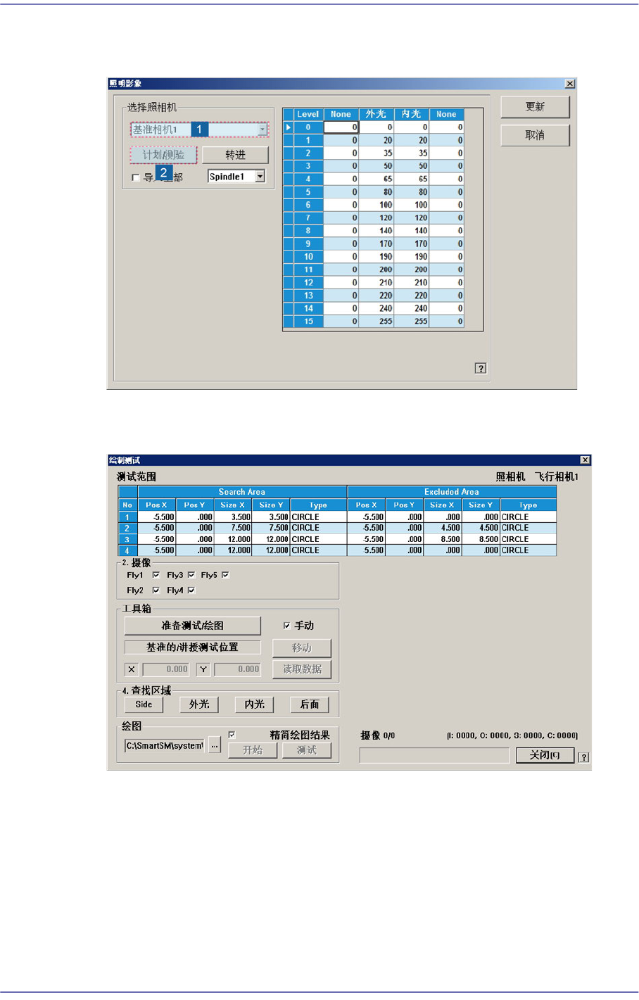 15-25 系统设置 必须在选择 < 请绘图简 结 果 > 校验框 的状态下执行 Mapping 。 状态表示 表示当前进行状况。 Camera (T est 或 Mapping 完成的 Camera 数 ) / ( 选定的 Camera 总个数。 ) (I: Inner Level, O: Outer Level, S : Side Level, C: Coaxial Le vel) < 关闭 > 按钮…