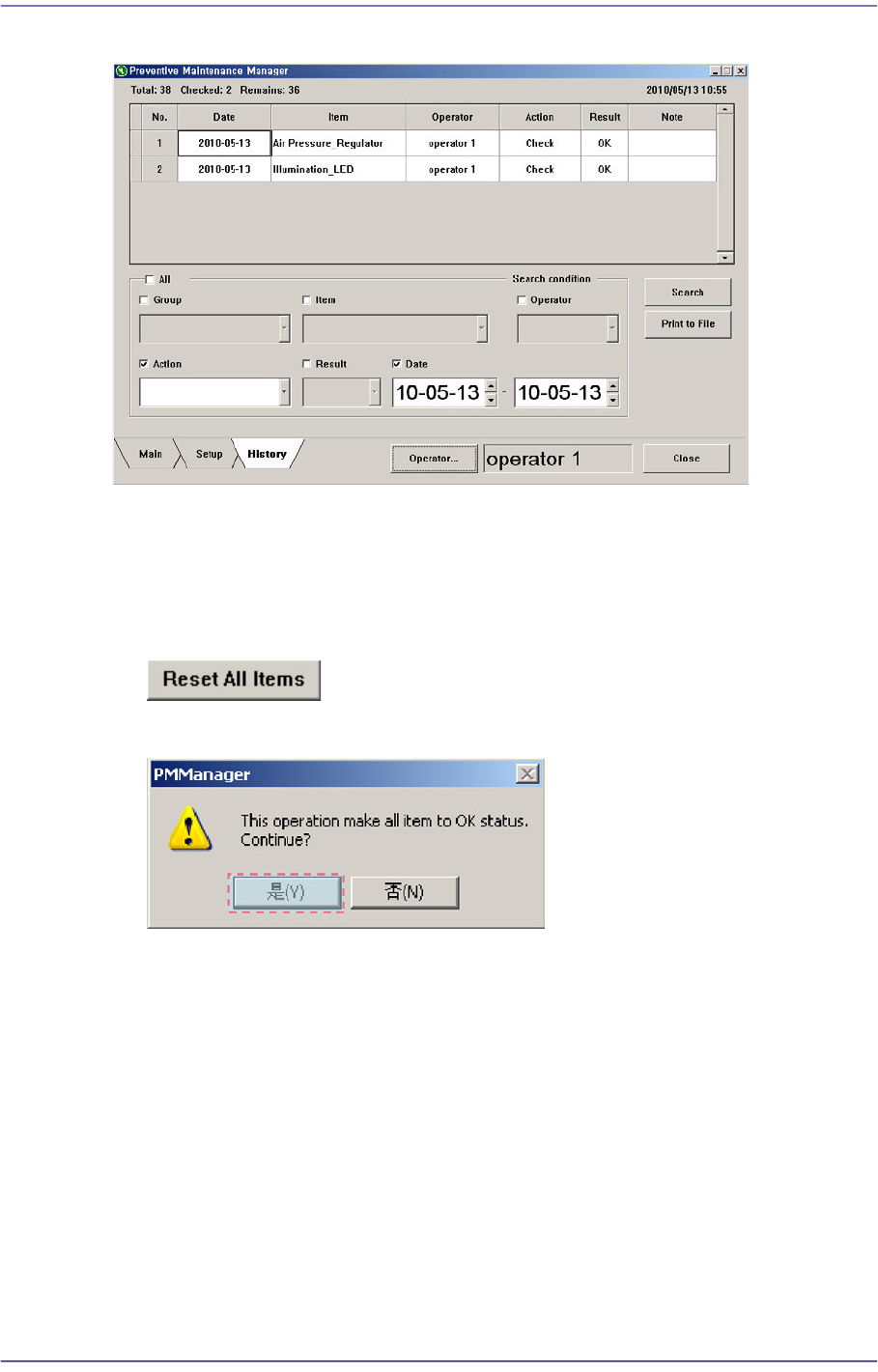 19-8 Next Generation, Multi-Function al Placer DECAN S1 Administrator’s Guide 图 19.7 PM Manager 的 Main 画面 History 画面中记录所有变更项目的历史, 同时在 Note 中显示 ”Reset all items” 。