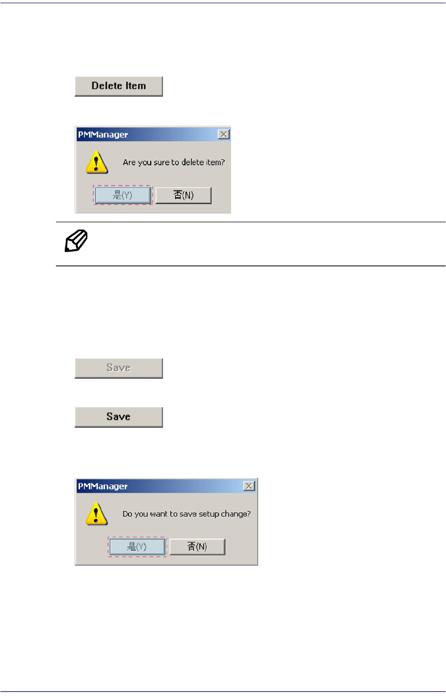 19-13 PM Manager 19.5.6. 删除使用者检查项目 可删除已登录的使用者检查项目。 方法如下。 点击 <Delete Item> 按钮。 点击 < 是 (Y)> 按钮删除 Item 。 备注 不能删除使用者检查项目以外的项目。 19.5.7. 保存变更事项 在 Setup 画面中如果 有更改的设置事项, <Save> 按钮被激活。 没有变更事项时 有变更事项时 要保存…