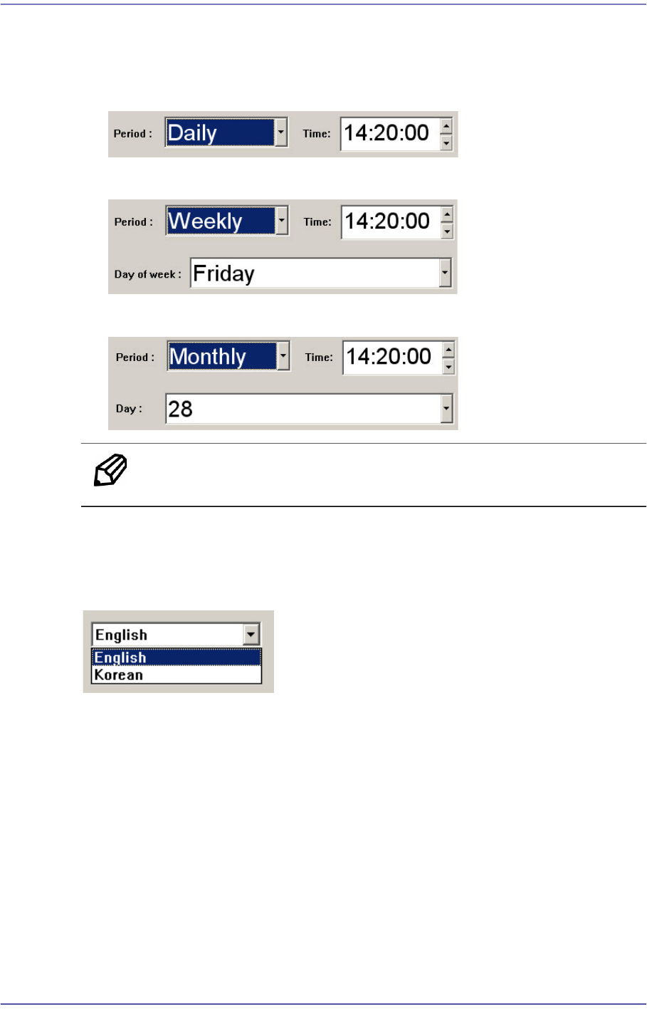 19-15 PM Manager 19.5.8.2. 设置预约检查时间 预约检查时间可设置为如下形式。 设置成每天 14 点 2 0 分提示预约检查功能时。 设置成每周星期五 14 点 2 0 分提示预约检查功能时。 设置成每月 28 号 1 4 点 20 分提示预约 检 查功能时。 备注 不能设置秒单位。 19.5.9. 语言设置 可更改 PM Mana ger 使用者界面的语言设置。 在 Setup 画面中选择合适的语言…