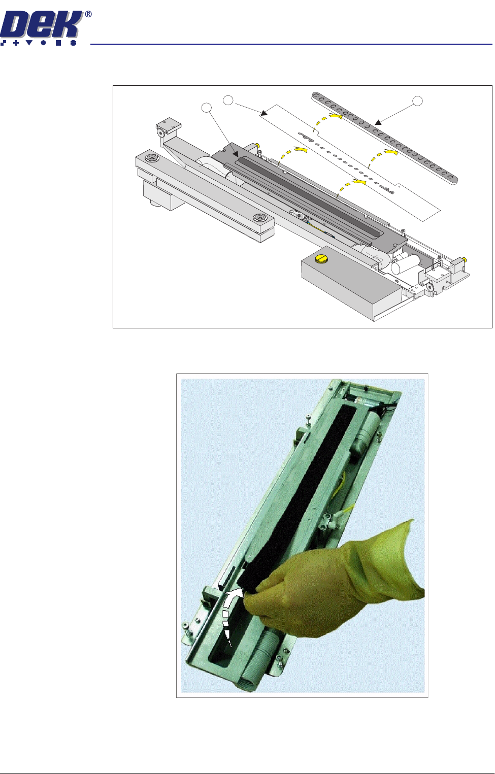 8. Fit the edge of the new cleaning cassette (1) beneath the solvent bar (3) and