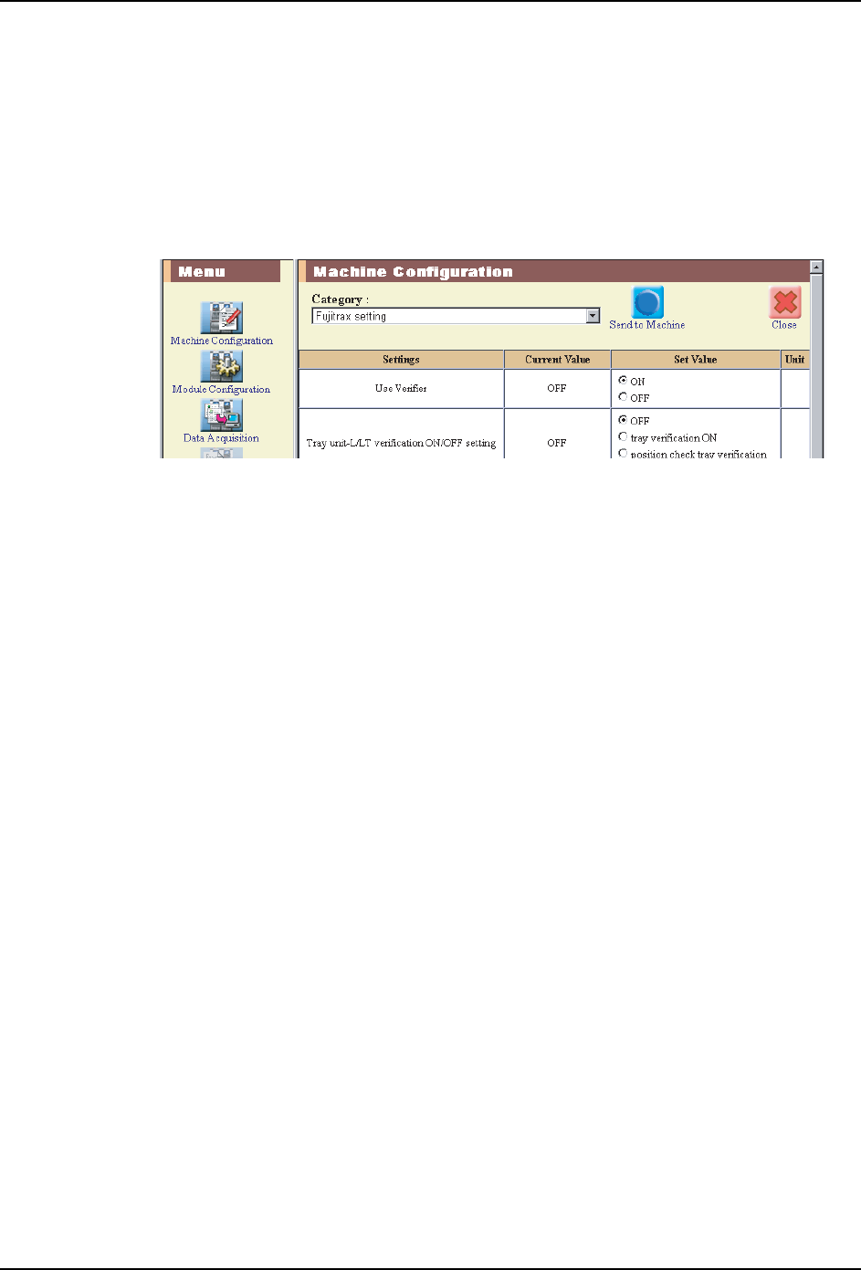 6. Fujitrax Verifier 的设定 SET-NXTIIc-1.5S 118 NXT IIc 安装手册 5. 输入用户密码,点击 [Log on ]。连接至机器后,最上方 的图示即被更改为与所选机器相 一致。画面左下方显示可执行项目 的菜单。画面右下方则显示有关所 选项目的详情。 6. 从 [Menu] 中选择 [ 机器结构 ]。附加软件将与机器相连接,接收机 器信息。上述操作 结束后,设定页面将被显示出来 。 7. 从 […