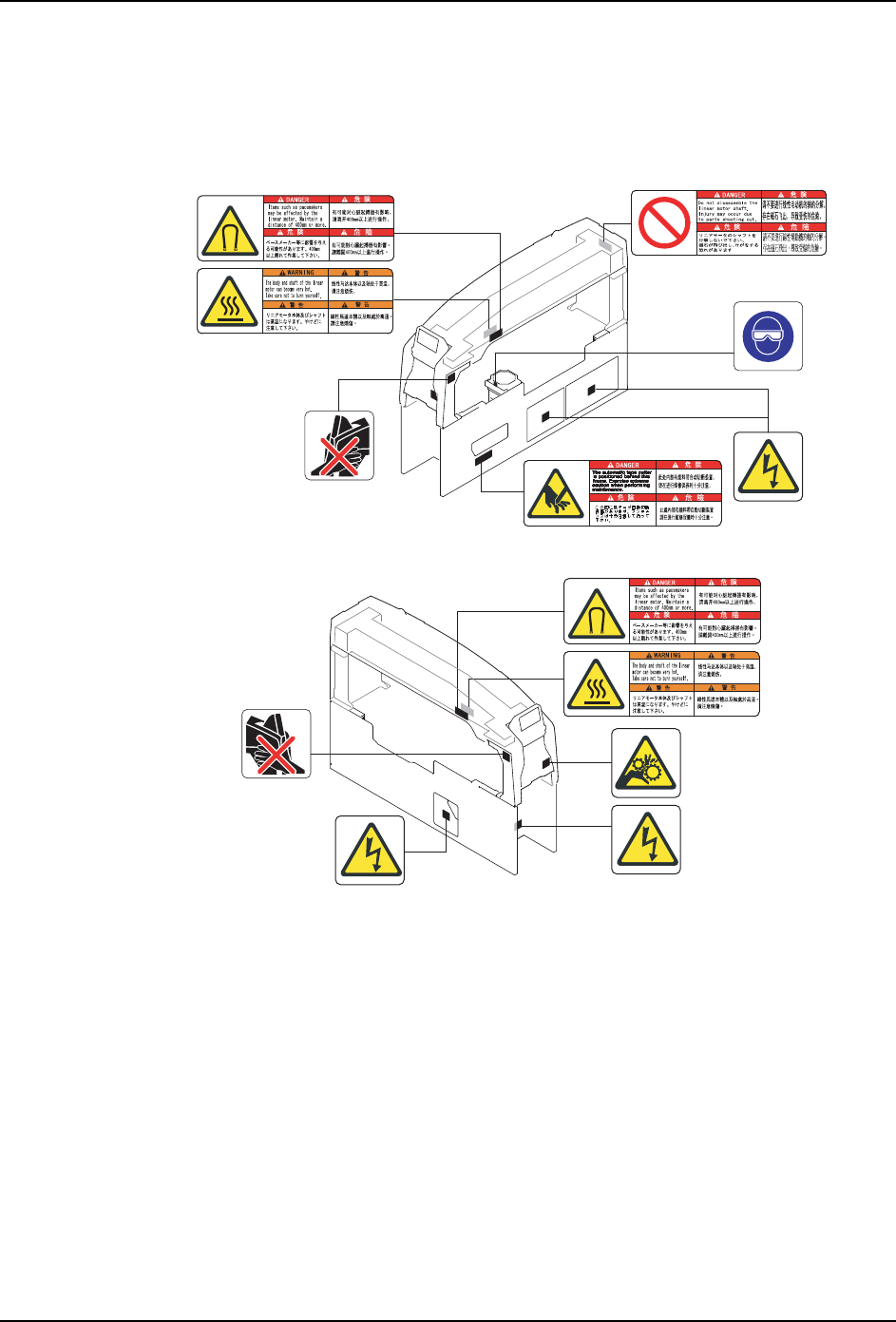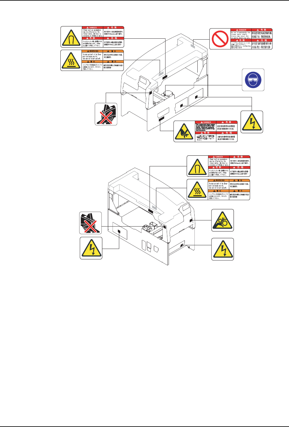 表示使用机器时的注意事项的安全标识贴在机器的下图所示位置。请仔细阅读记载内容,安