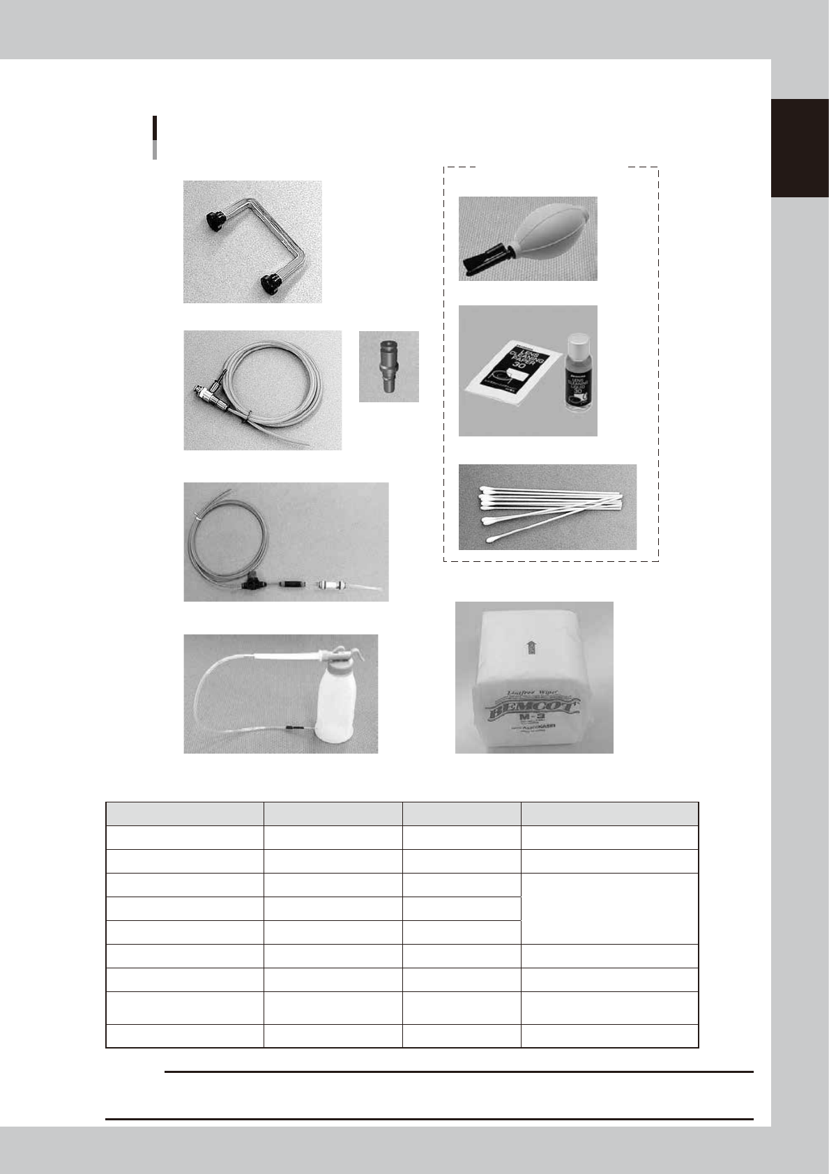 1-13 1 Maintenance n Cleaning tools (Optional parts) Cleaning tools Optional parts Nozzle cleaning wire handle Air blow tool Air socket Cotton swab (15 cm) Blower brush Cleaning kit Cleaning wiper V acuum assembly CLEANE…