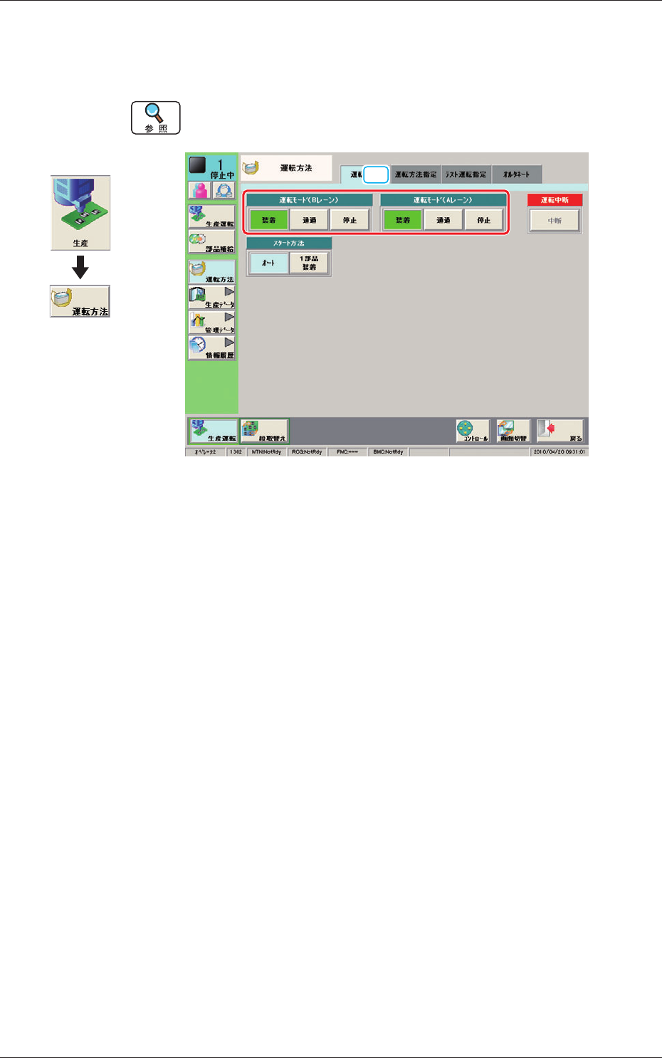 “生産運転”画面の上部“状態表示”に、切替えた運転モードが表示