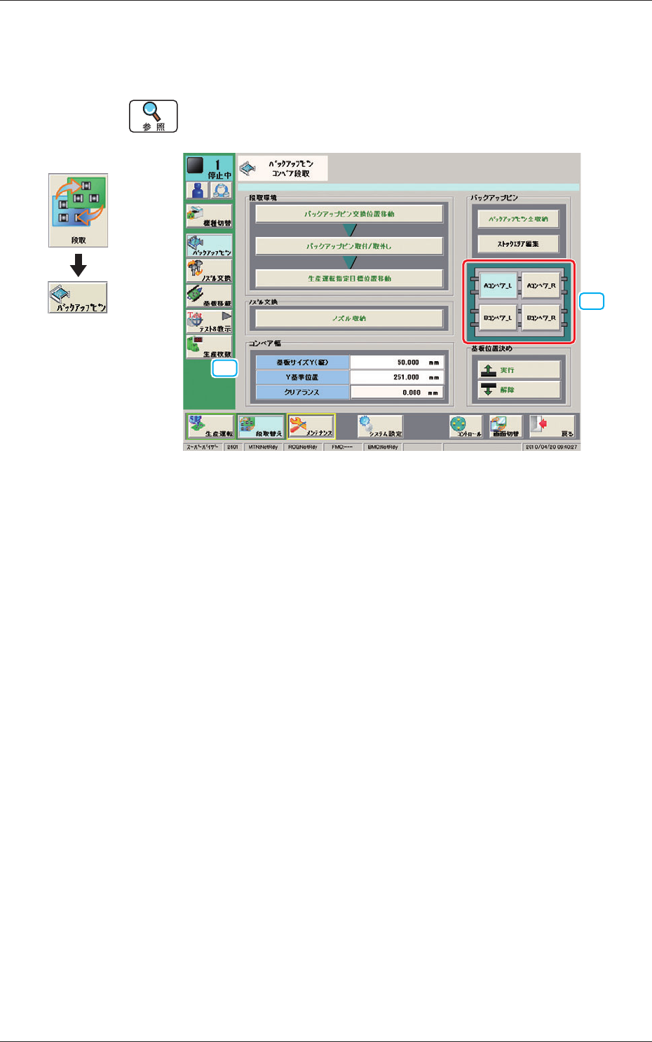 押すと、選択したバックアップベースが下降し、基板が位置決めが