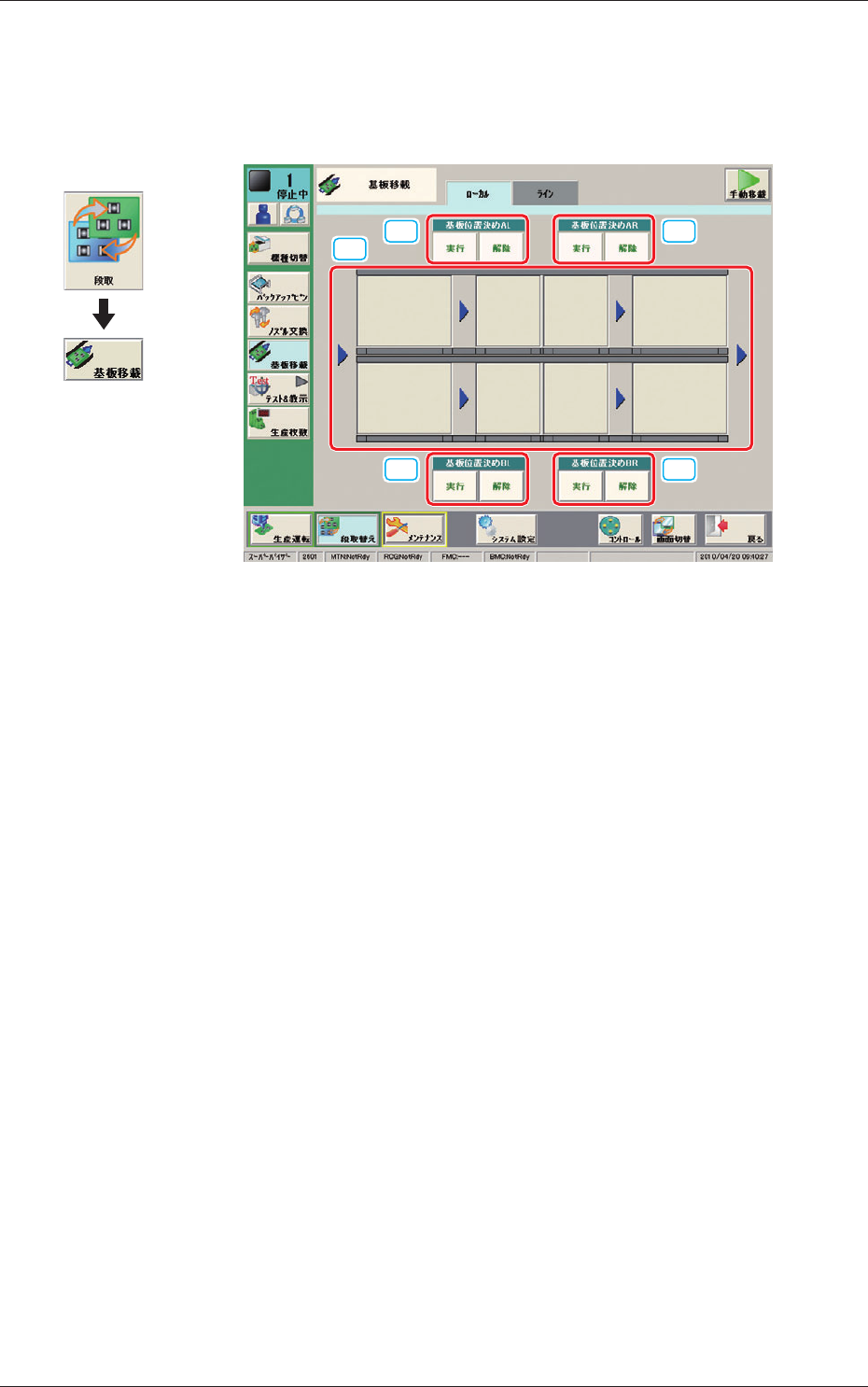 9 OM-1645 6. 基板移戴 コンベア上の各レーンの各ブロックにある基板を次のブロックへ移 動させることができます。 [1] [2] [2] [2] [2] 基板移載F9 [1] コンベアイメージ表示部 イメージ表示されているコンベアの各レーン、各ブロックはボタン になっています。 コンベアブロックのボタンを押し、 10 秒以内に操作パネルの [START] ボタンを押すとその位置まで基板が移戴されます。 [2] 基板位…