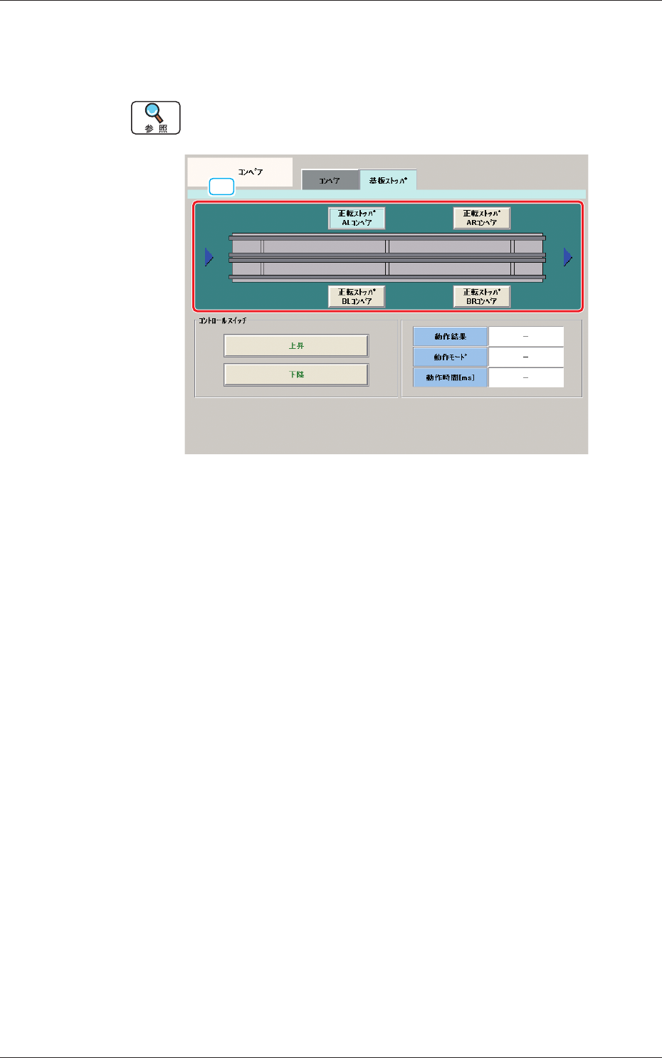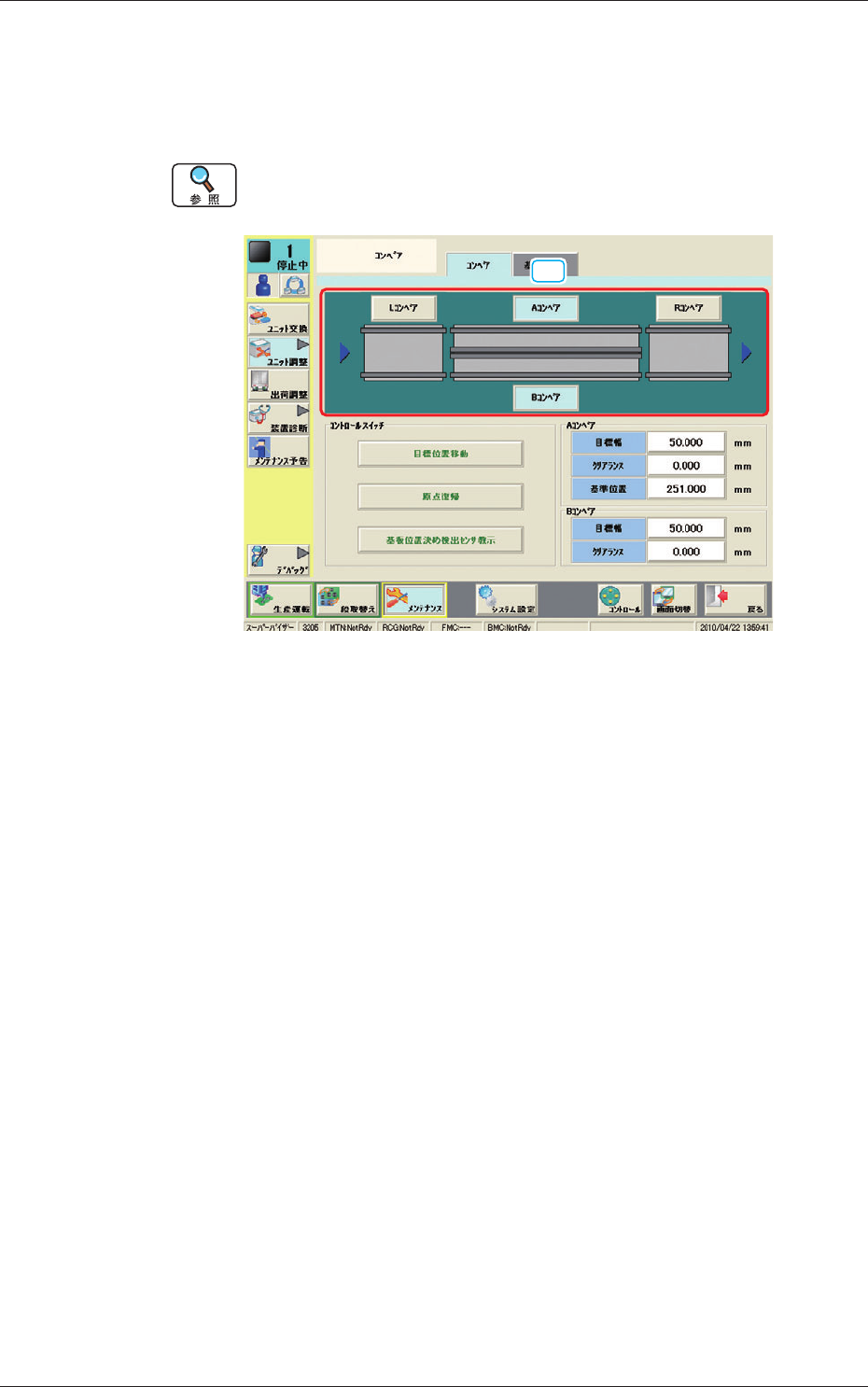 14 OM-1645 10.1 コンベア 各レーンのコンベア幅の一括段取替え、手動段取替えの調整操作を行いま す。 デュアル搬送対応以外の説明については、 “SIGMA-G53 巻1 章4.3.1 コンベア”を参照してください。 [1] F14 [1] コンベア選択ボタン 目標位置移動、基準位置調整または幅調整を行うコンベア部位(L コ ンベア、A コンベア、B コンベア、R コンベア)を選択します。 10.1 コンベア 1…
