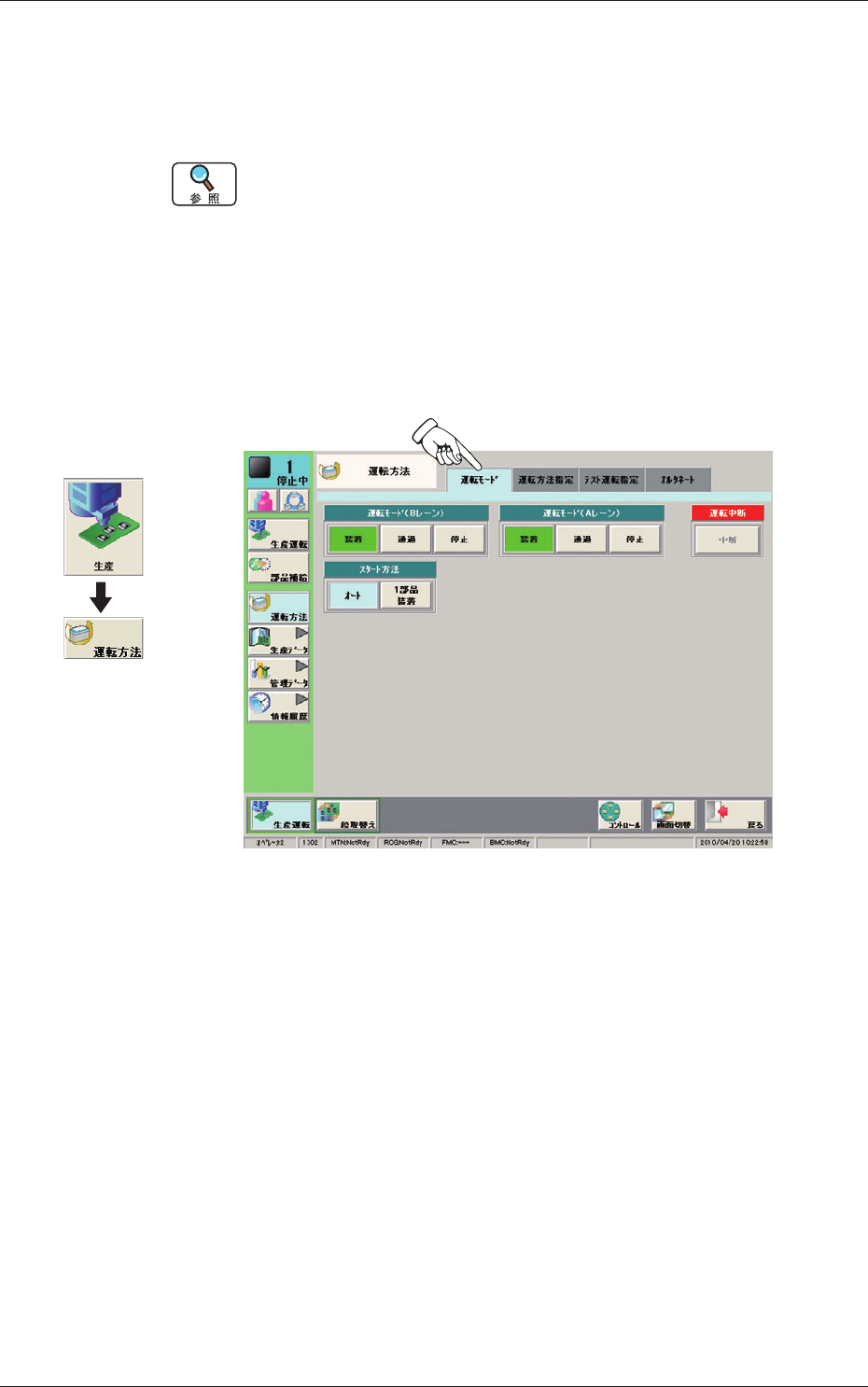 16 OM-1645 11. 生産機種の切替え 1004-001 11. 生産機種の切替え 生産機種の切替えにおけるデュアル搬送対応での変更のある項目を説明 しています。 デュアル搬送対応以外の説明については、 “SIGMA-G51 巻3 章2.生産 機種の切替え”を参照し、正確な手順で作業を行ってください。 11.1 運転モードの選択 “運転方法”画面で運転モードを設定します。 各レーンごとの運転モードを選択します。 …
