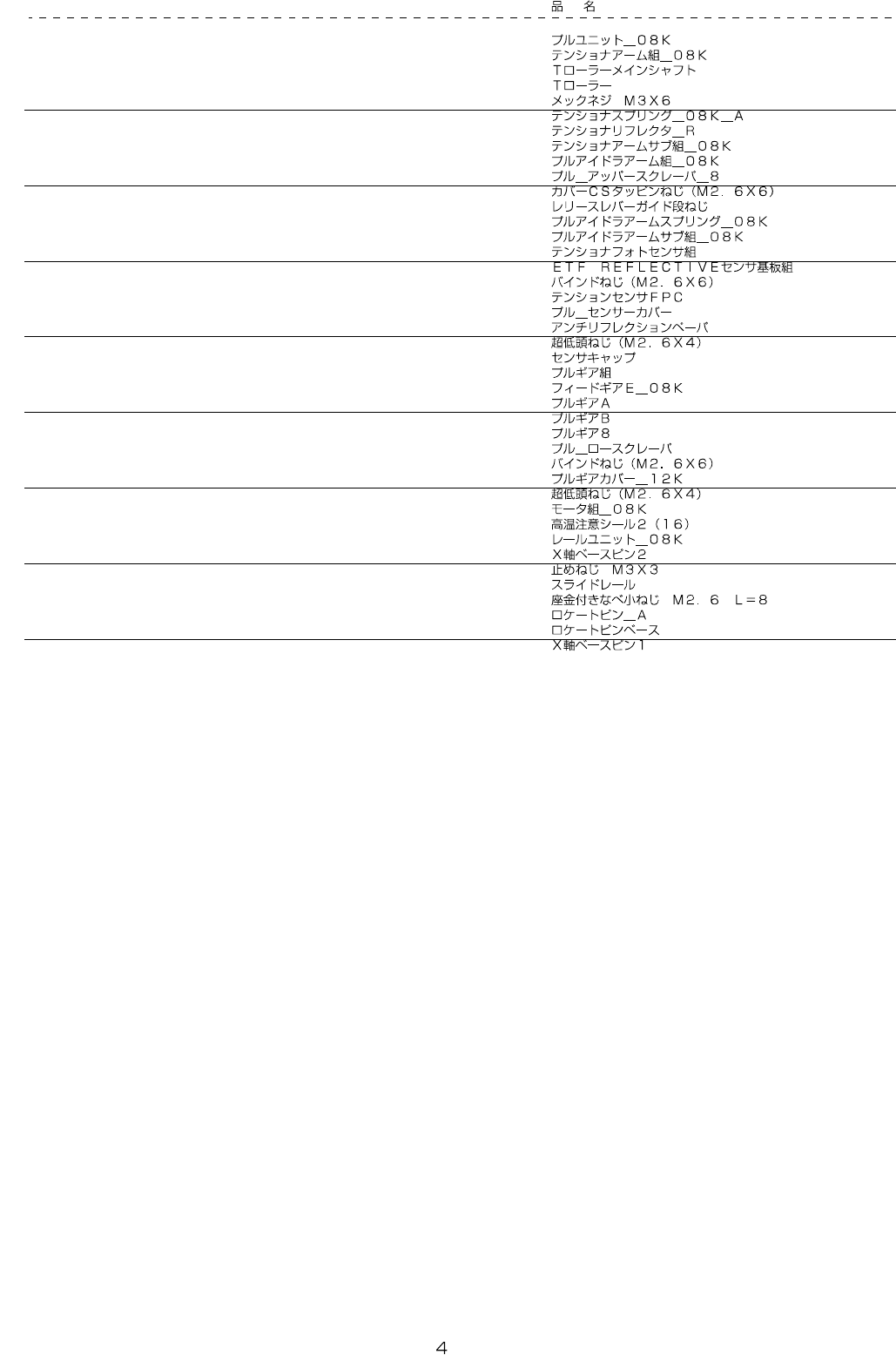 - - REF.NO NOTE PARTNO DESCRIPTION Qty 1 401-69519 PULL_UNIT_08K 1 2 401-695 37 TENSIONER_ARM_A SSY_08K (1) 3 401-672 41 T_ROLLER_MAIN _SH ( 1) 4 401-67240 T_ROLLER (1) 5 400-520 50 SCREWM3X6 MEC ( 1…