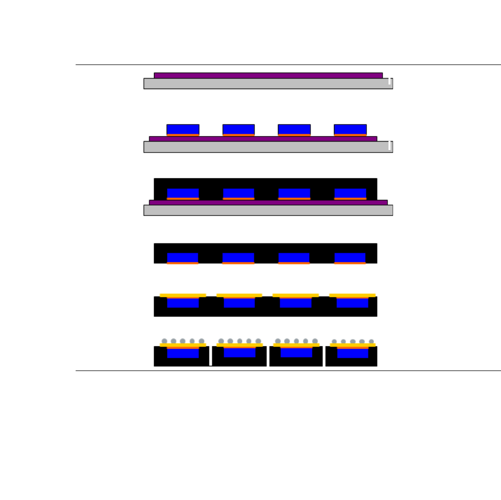 Fig. 4.1 - 5 Steps in the Embedded Wafer Level Ballgrid Array process