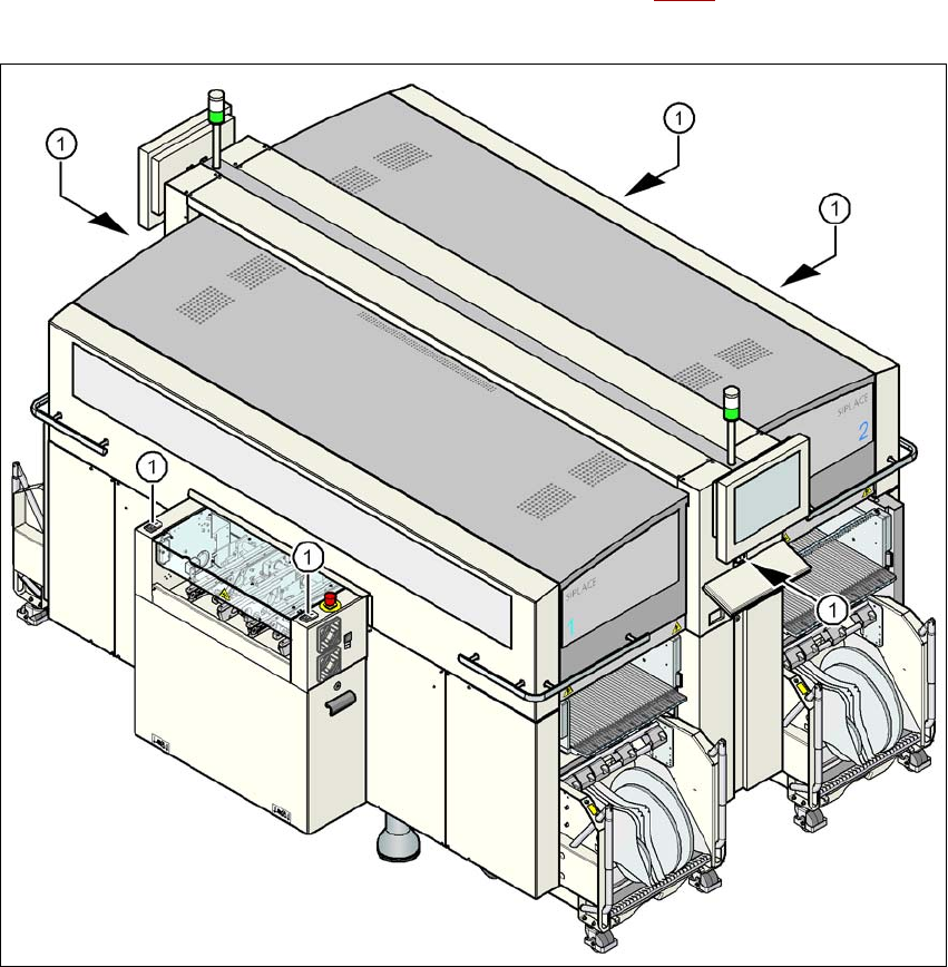 Bezpe č nost práce Návod k obsluze SIPLACE X-série Bezpe č nostní za ř ízení Od verze software SR.70x.xx Vydání 01/2011 74 2.6.2 S pína č e a tla č ítka na automatu 2.6.2.1 Umíst ě ní spína čů a tla č ítek na autom atu 2…
