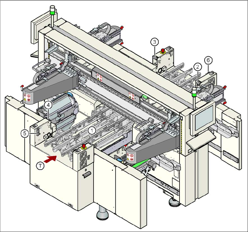 Návod k obsluze SIPLACE X-série Bezpe č nost práce Od verze software SR.70x.xx Vydání 01/2011 Bezpe č nostní za ř ízení 75 2 Obr . 2.6 - 4 Poloha spína čů a tla č ítek - pohled na stranu vstupu desek (1) Nouzové stop tla…