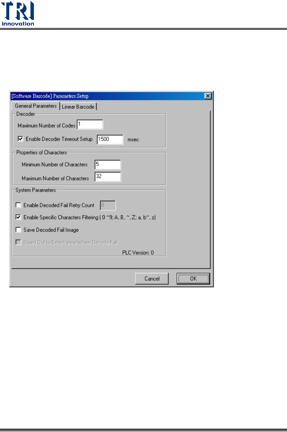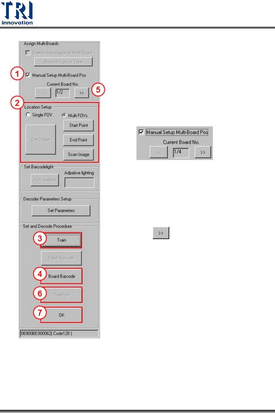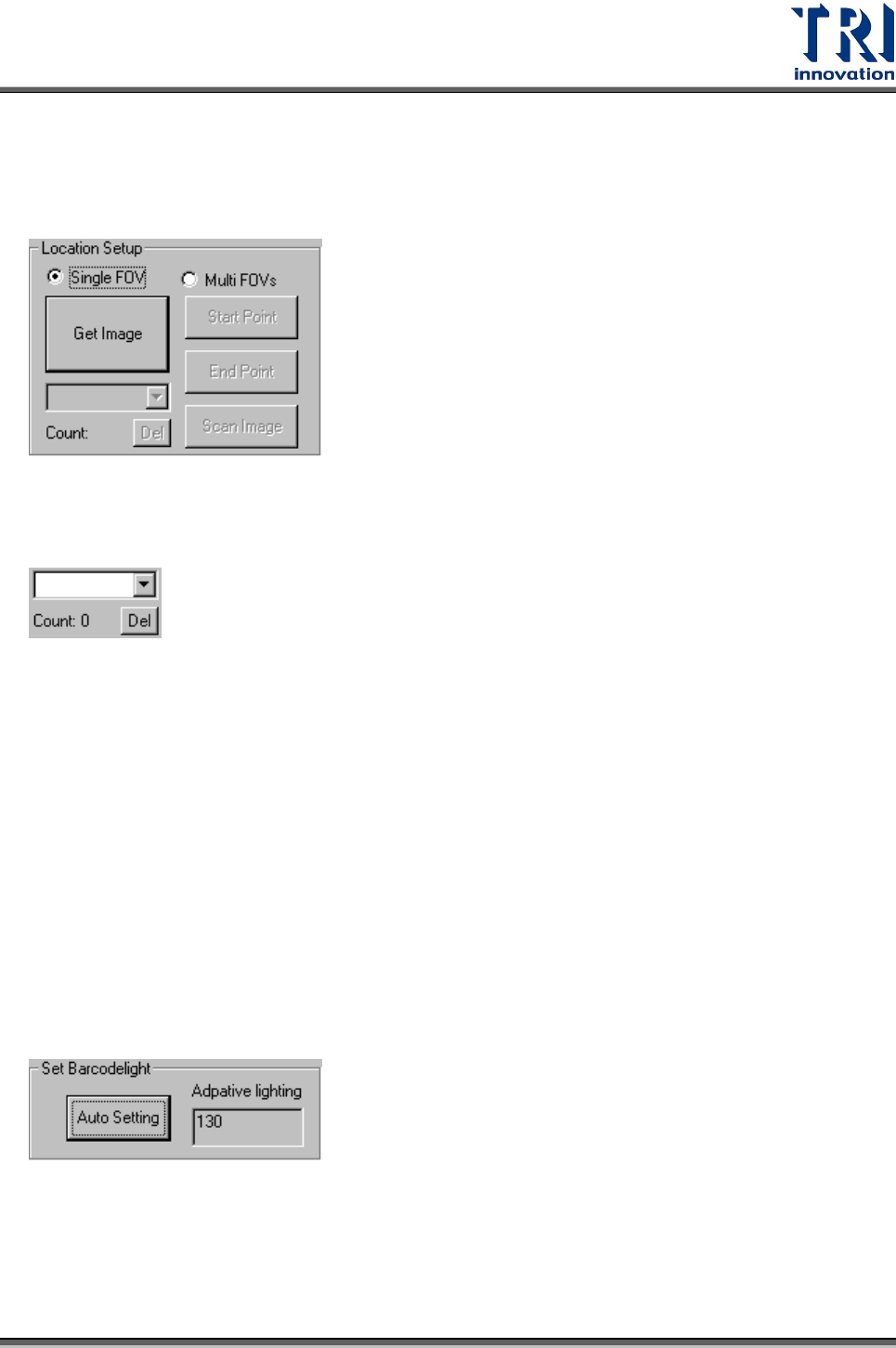 Test Research Inc. 122 TR 7700 S II User Guid e – Softwar e 3.3.15.2.6 Location Setup — 指定條碼所在位置及掃描條碼影像 Single FOV – 當條碼的大小在一個 FOV 範圍內,點選 [Single FOV] ,且使用 [Get Image] 按鈕擷取影像。 下拉選取方塊、 [Count] 欄位以及 [Del] 按鈕為特殊功能,一般情況下…