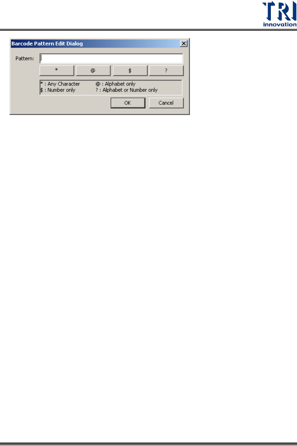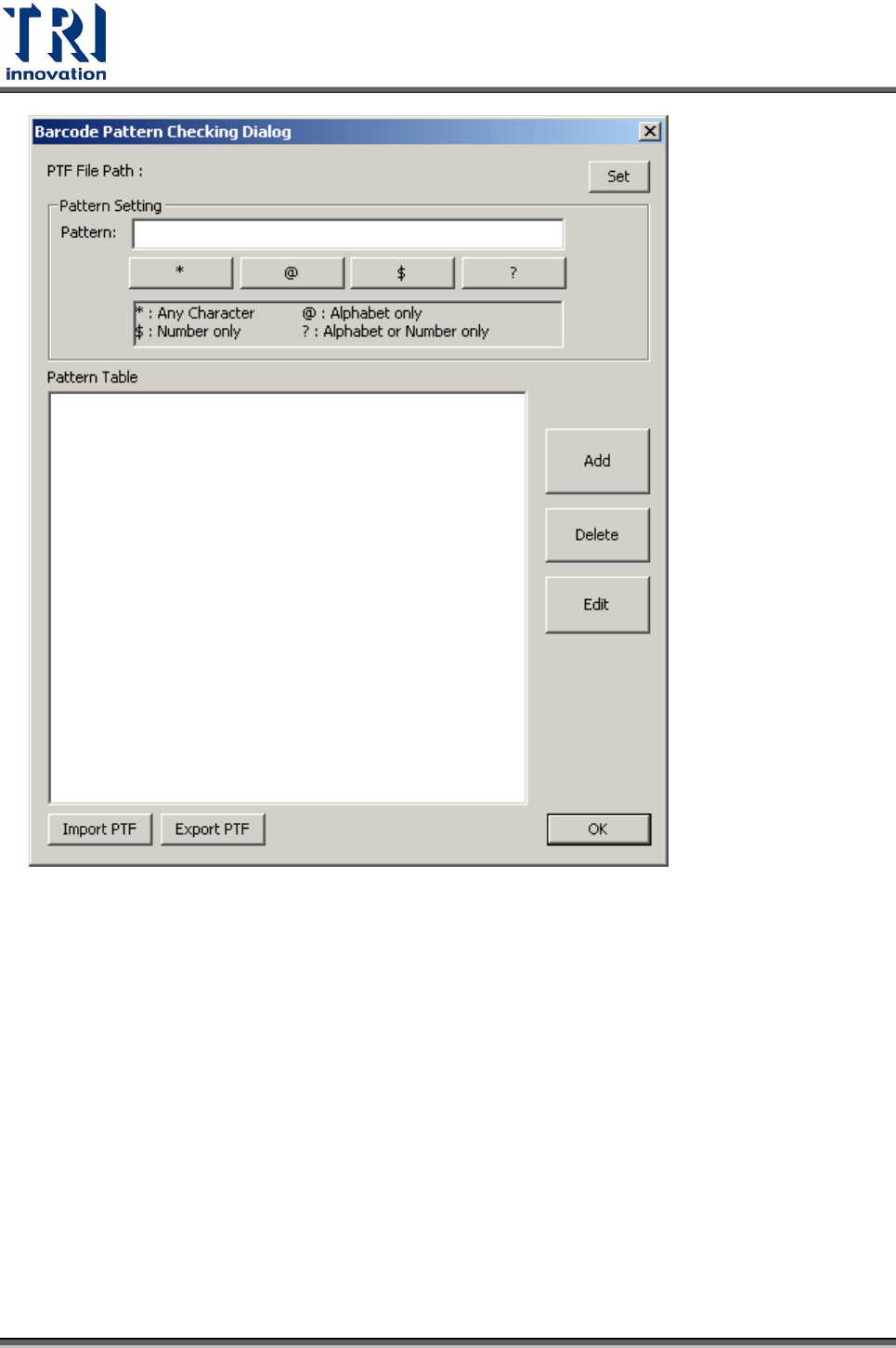 Test Research Inc. TR 7700 S II User Guid e – Softwar e 249 PFT File Path :顯示目前此專案檔所搭配的 PTF 檔名。 Set :設定目前此專案檔所要搭配的 PTF 檔。 Pattern Setting :輸入想要檢測的條碼格式。 Add :將建好的條碼檢查格式加入 Pattern Table 。 Delete :將 Pattern Table 內所選擇的條碼格式刪…