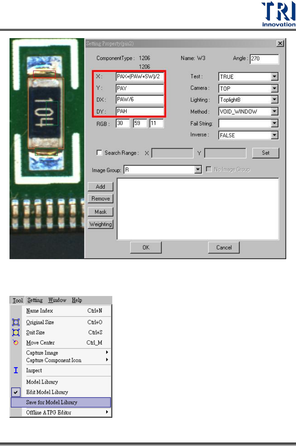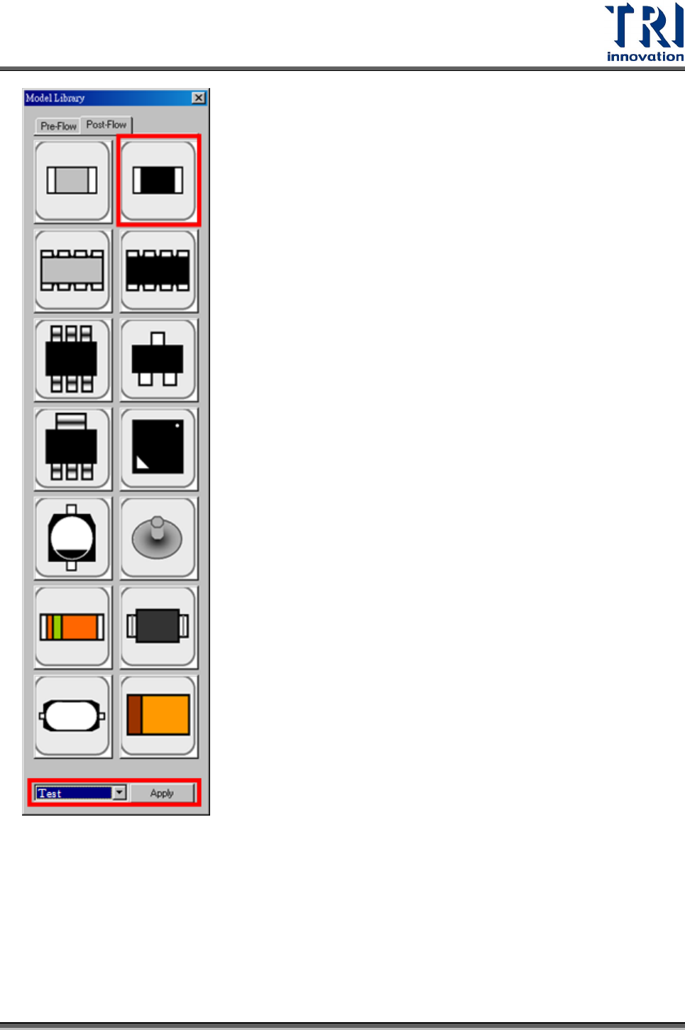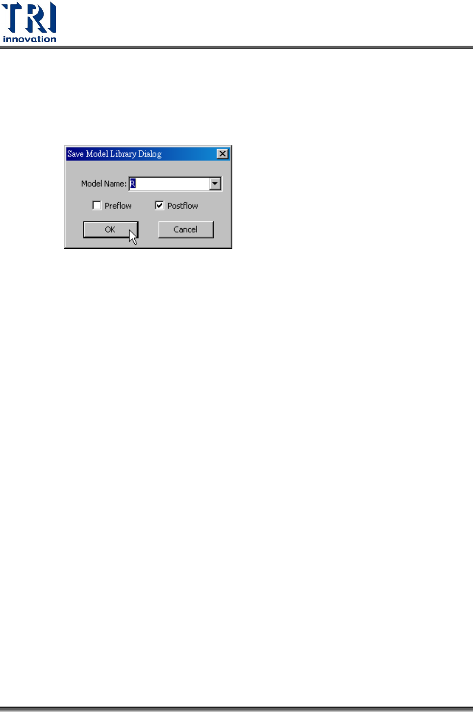 Test Research Inc. TR 7700 S II User Guid e – Softwar e 341 Step5. 出現對話框選擇類型名稱和爐前 (Preflow) 或爐後 (Postflow) 。按 [OK] 存檔即 可。 Model Name 可以下拉方式選擇已存在的類型,或是自行手動輸入新的 類型名稱。若是選擇已存在的類型,則未來在套用時直接點選該類型圖示即 可,若是自行新增類型,則新增的類型會被安排顯示在對話框…