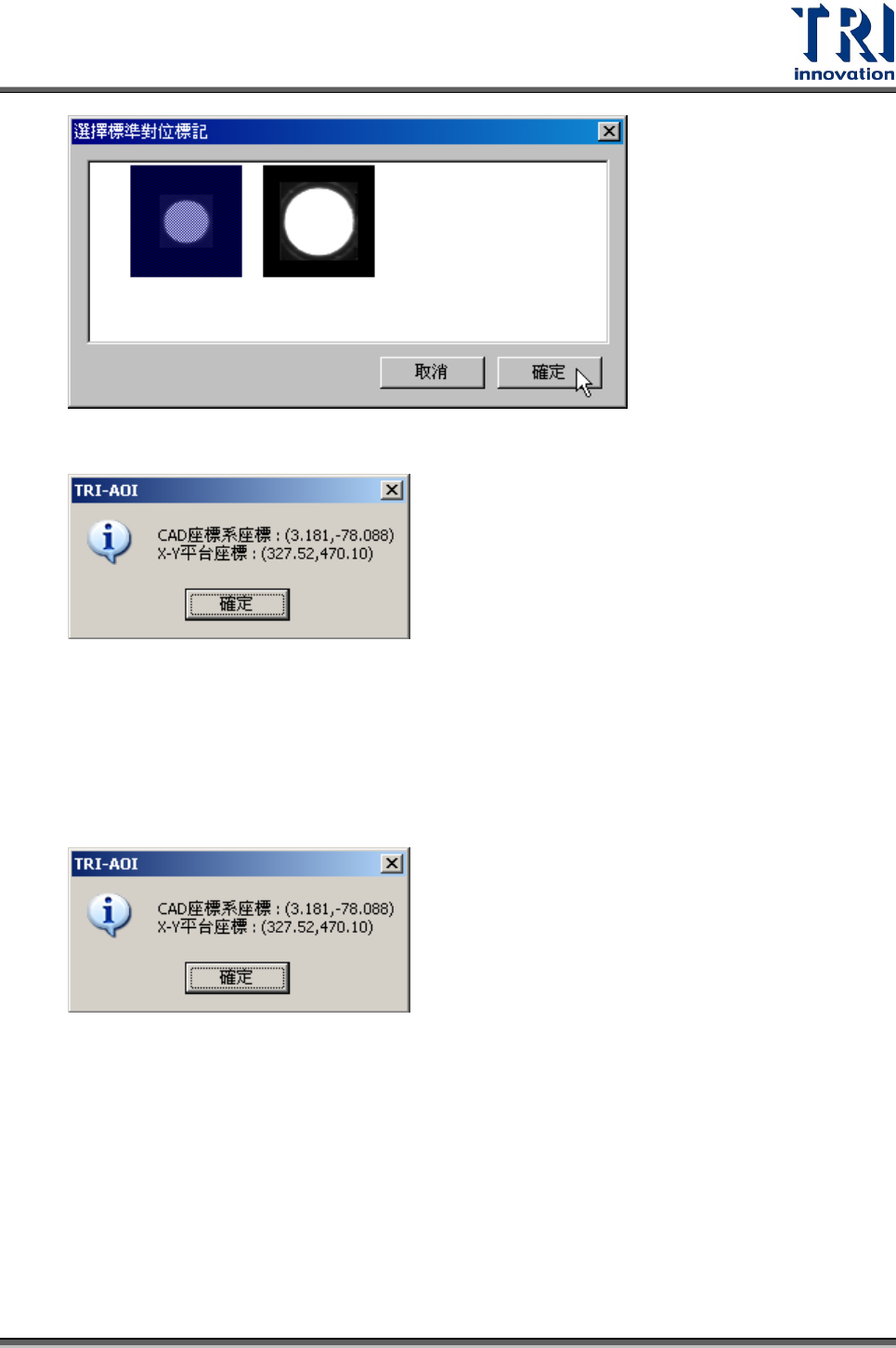 Test Research Inc. TR 7700 S II User Guid e – Softwar e 31 5. 按下 [ 擷取對位標記 ] 按鈕 ( ) 進行對位標記影像擷取動作。完成後,在影像右上 方會出現對位標記的縮圖,如下圖所示。 6. 在按下 [ 擷取對位標記 ] 按鈕 ( ) 後,會出現以下視窗。若所能擷取到的對位標記 影像不佳,則可選擇 [ 是 ] ,選擇合適的影像使用。 使用標準對位標記影像 Step1. …