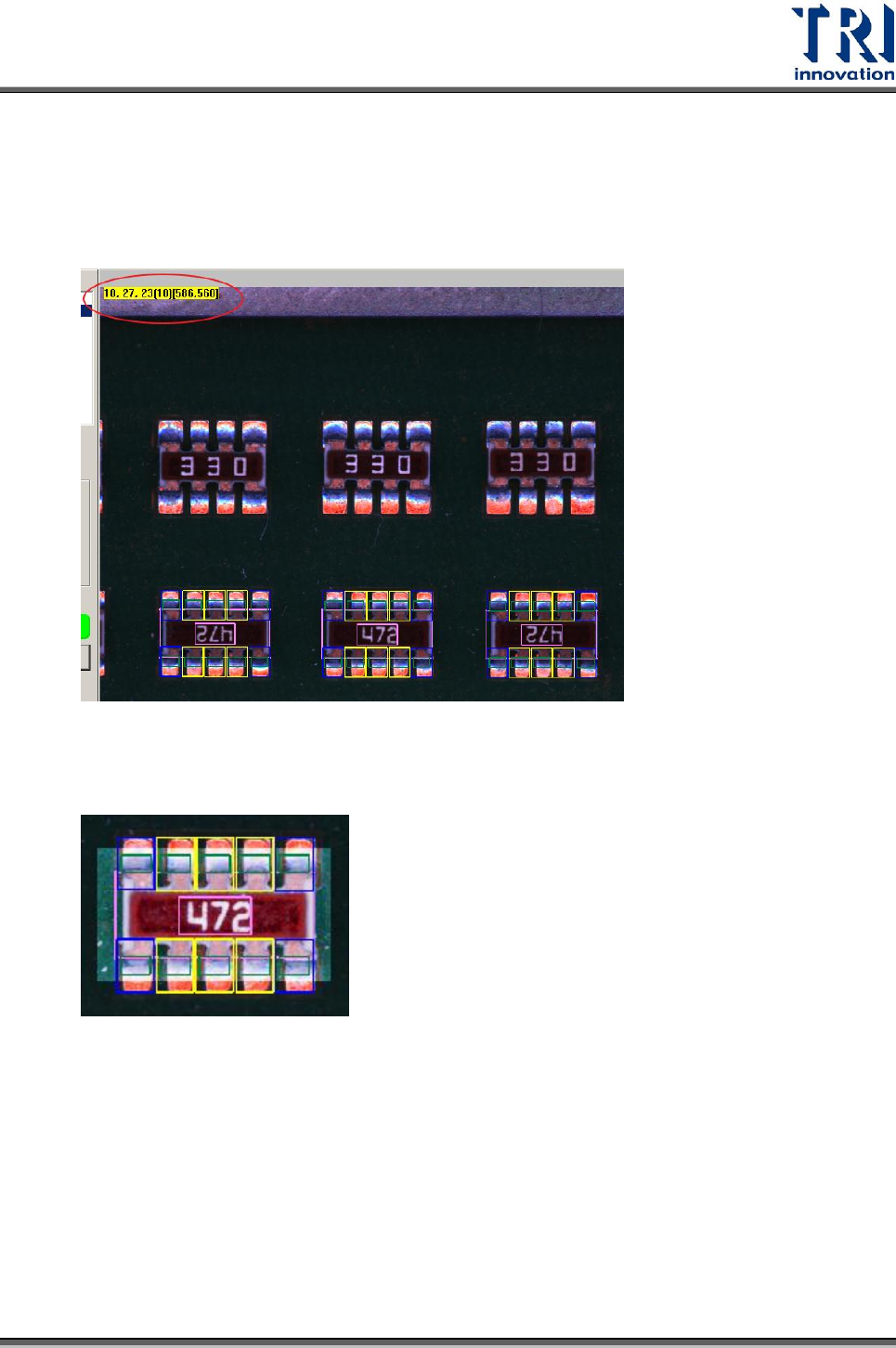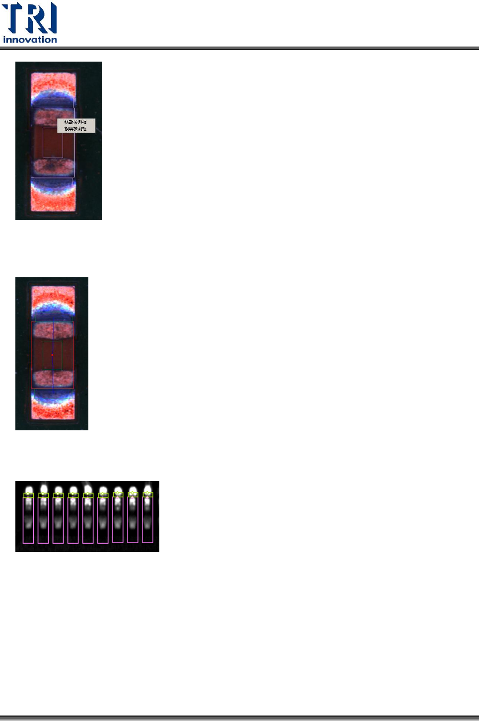 Test Research Inc. 472 TR 7700 S II User Guid e – Softwar e 6. 隱藏所有檢測框 :勾選表示在影像上不顯示任何檢測框。 7. 顯示 RGB :勾選後,在 FOV 影像的左上角將會顯示 RGB 的權重。前三個數字分 別表示游標位置的 R 、 G 、 B 分量,而括弧內的數字表示權重計算後的灰階值, 最後括號內所顯示的是目前滑鼠游標所在的座標位置 ( 左下角為原點 ) 。 8. 顯…
