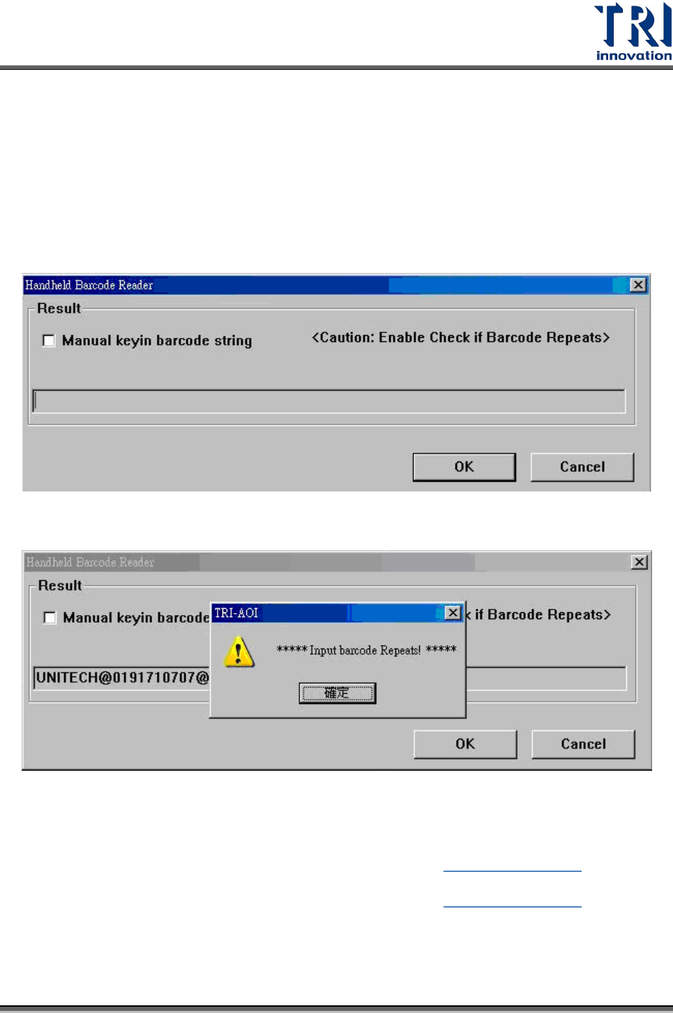 Test Research Inc. TR 7700 S II User Guid e – Softwar e 95 Enable handy barcode prescan function :本功能只有設定在使用手持式條碼機時 才有作用。勾選表示使用者可在讀取條碼對話框未出現之前,預先掃描一筆條碼資 料,在下一片檢測時直接帶出作為下一筆檢測的條碼。 Assign Barco de : AOI 使用者手動指定條碼順序 讓使用者…