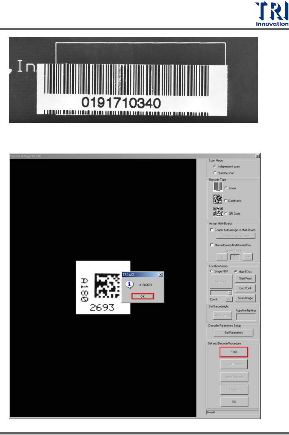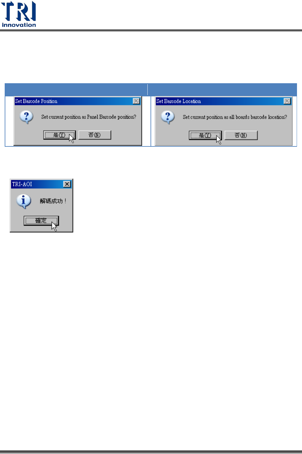 Test Research Inc. TR 7700 S II User Guid e – Softwar e 117 Step4. 若此條碼為整片板子上需要讀取的單一條碼,點選 [Panel Barcode] 。若這片 電路板為多連板,且多連板上每一條碼都需要個別讀取時,點選 [Board Barcode] 。 Panel Barcode Board Barcode Step5. 按下 [TestRun] 鈕解碼。系統會根據設定所要讀…