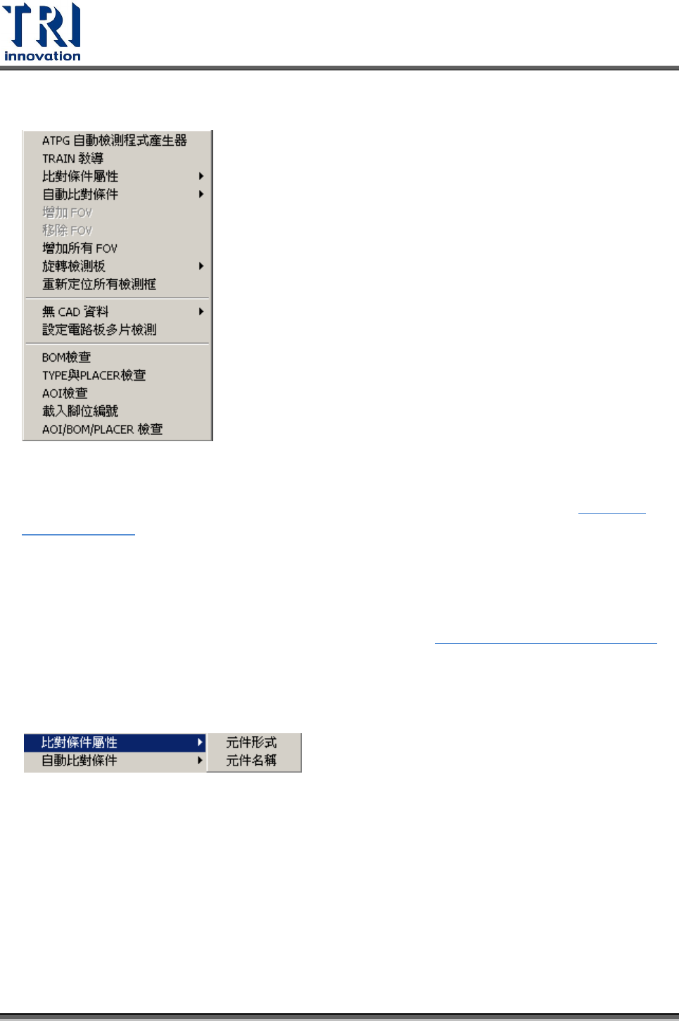 Test Research Inc. TR 7700 S II User Guid e – Softwar e 131 3.4 程式 3.4.1 ATPG 自動檢 測程式產生器 點選此功能可以進入 ATPG 自動檢測程式產生器流程視窗,詳細內容請參閱 第四章: ATPG 功能介紹 。 3.4.2 TRAIN 教導 點選此功能此按鈕可以進入教導模式。 詳細 內容 請 參 閱 第五章: Train 視窗功能介紹 。 3.4.3 比對條件屬性…