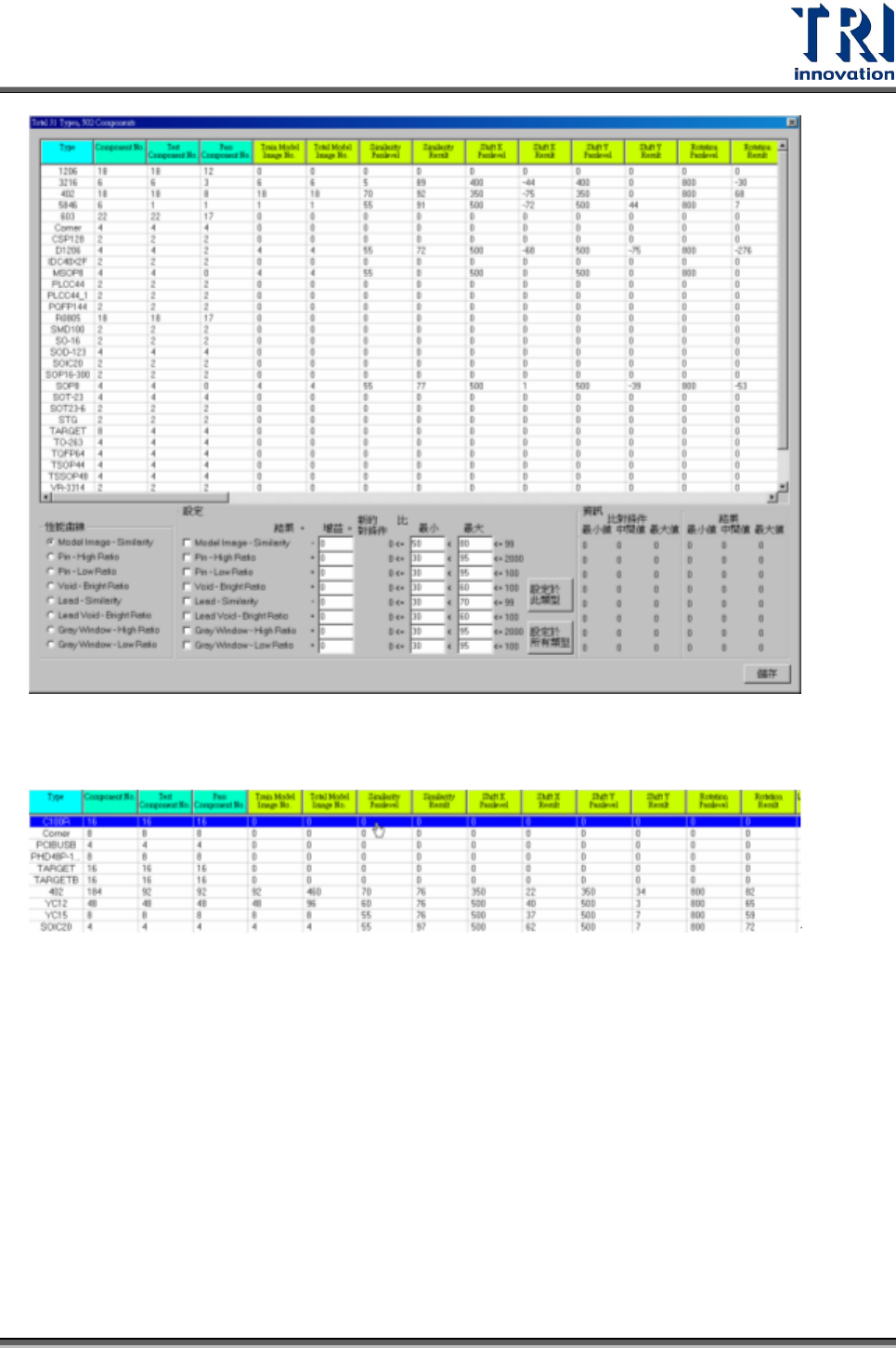 在元件形式列表中,前四欄表示元件的基本資訊,接下來分別顯示各種檢測框的資