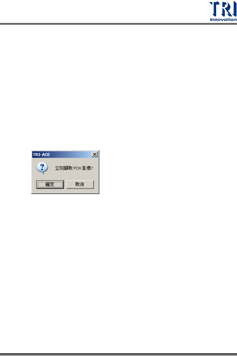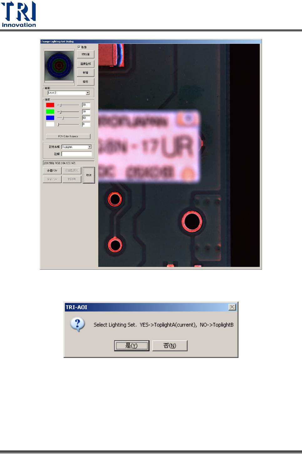 Test Research Inc. TR 7700 S II User Guid e – Softwar e 141 當選擇 [ 取消 ] ,會出現以下視窗。選擇 [ 是 ] 會使用 ToplightA 的光源設定; 而選擇 [ 否 ] 會使用 ToplightB 的光源設定。 Step4. 當取像光源設定完成後,使用者可以使用同樣的方式繼續在其他地方新增 FOV 。 Step5. 當欲增加的 FOV 設定皆完成後,再次選擇 [ …