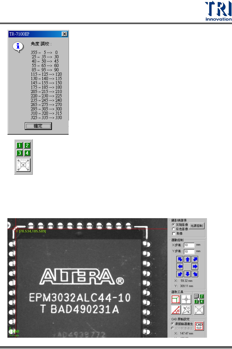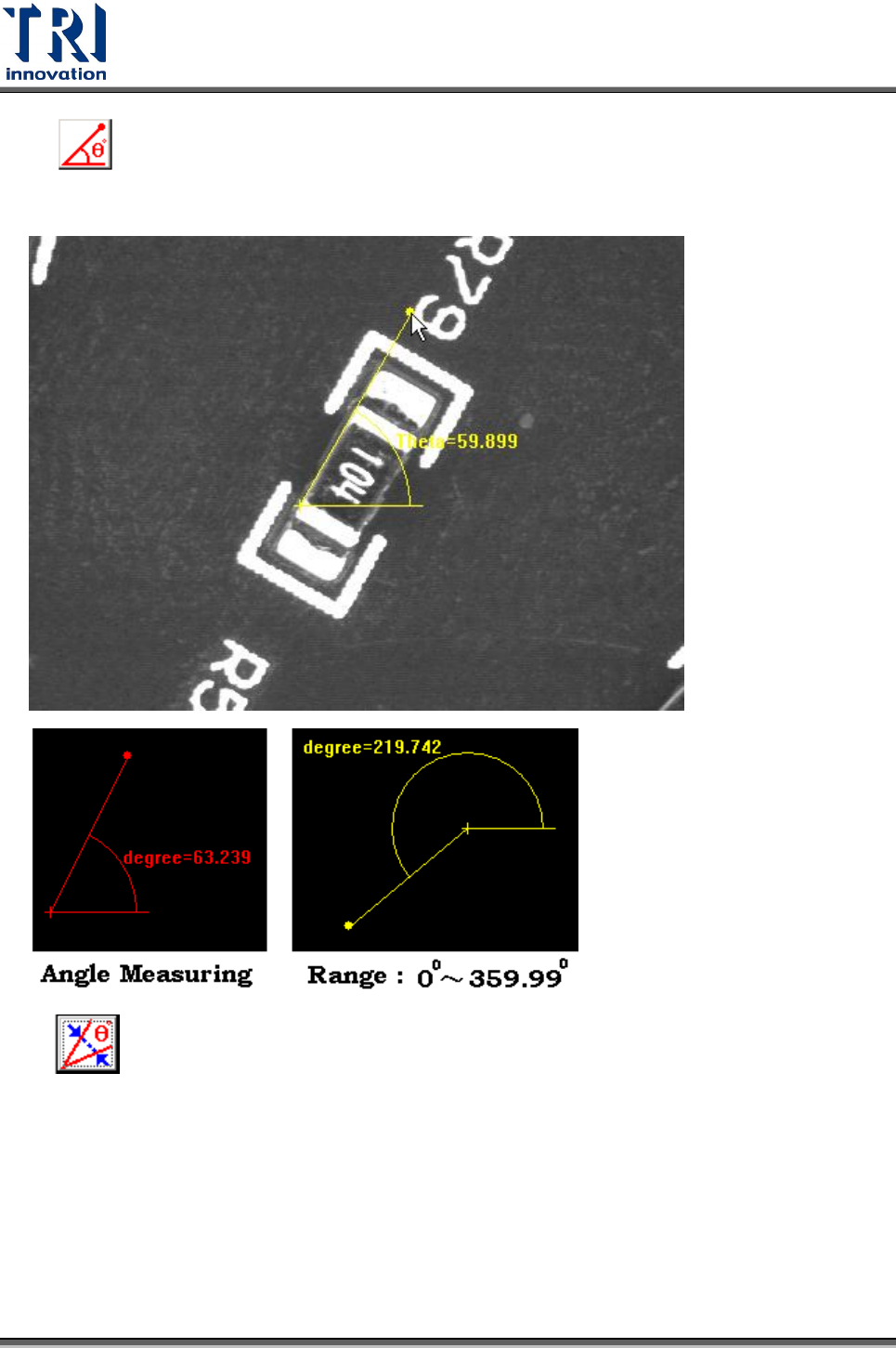 Test Research Inc. TR 7700 S II User Guid e – Softwar e 147 角度量測 定義元件角度的工具 。若元件具有特殊角度可利用此工具來量測。 角度校正 由於使用 [ 角度量測 ] 工具所量得的值會有些許誤差且並非整數,按下此按鈕可以 輔助角度量測工具,將所量得的角度一以下邏輯進位成為整數。