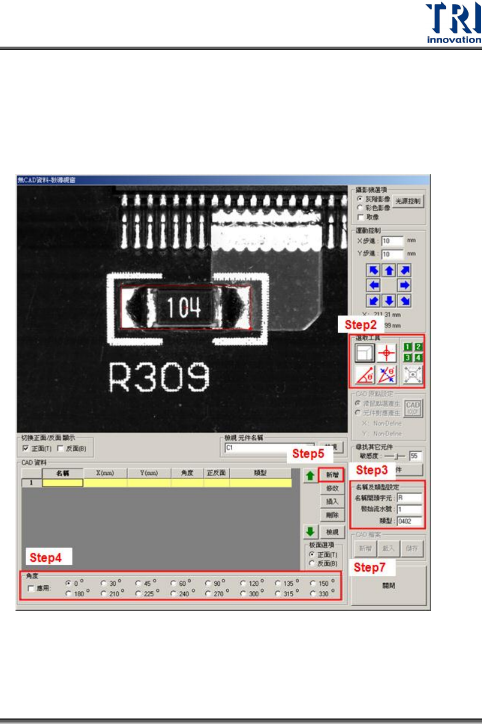 Test Research Inc. TR 7700 S II User Guid e – Softwar e 163 Step5. 按下 [ 新增 ] 按鈕,系統會將新增元件資訊列在 [CAD 資料 ] 欄位中。 Step6. 在 1 號板上新增其他元件。 Step7. 按下 [ 關閉 ] 按鈕離開。 Step8. 按下 [ 程式 ]>[Train 教導 ] 或 [Train] 按鈕 ( ) ,進入教導視窗。 Step9. 使用…