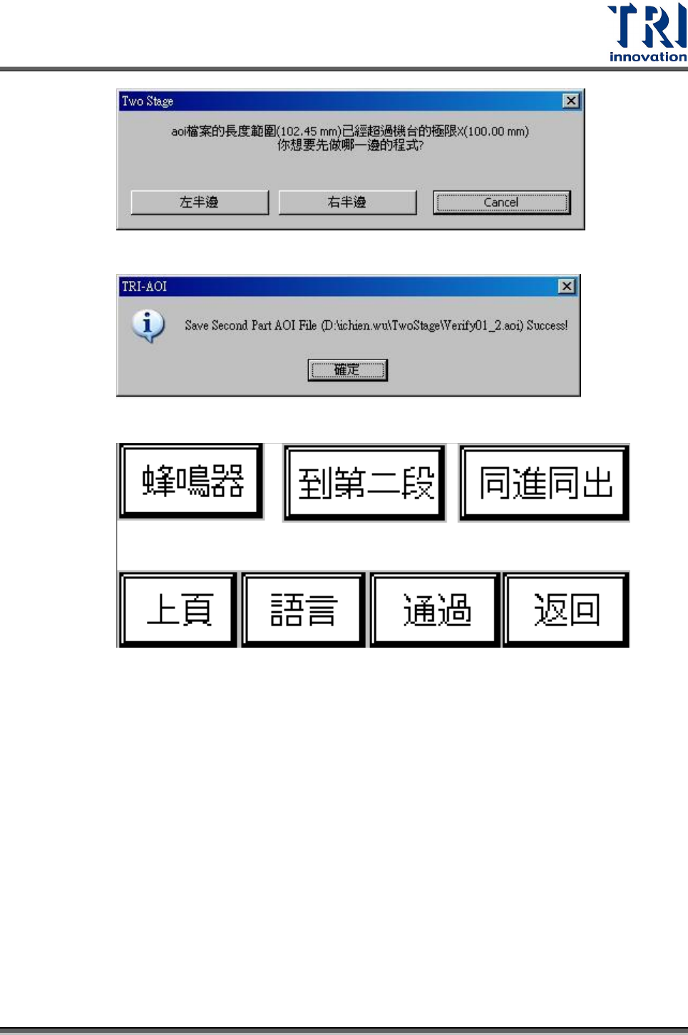 Test Research Inc. 178 TR 7700 S II User Guid e – Softwar e 3) 如果使用者選擇了左半邊或是右半邊後 , TRAOI 會將 aoi 檔分成兩半 , 將另 一邊自動存成 [aoi 檔名 ] _2 .aoi 。 4) 確認 PLC[ 到第二段 ] 反白。 5) 做完程式後存檔,準備做第二段程式時 , 將 PLC [ 兩段測試 ] 反黑。 6) 載入第二段的 aoi 檔 ([aoi …