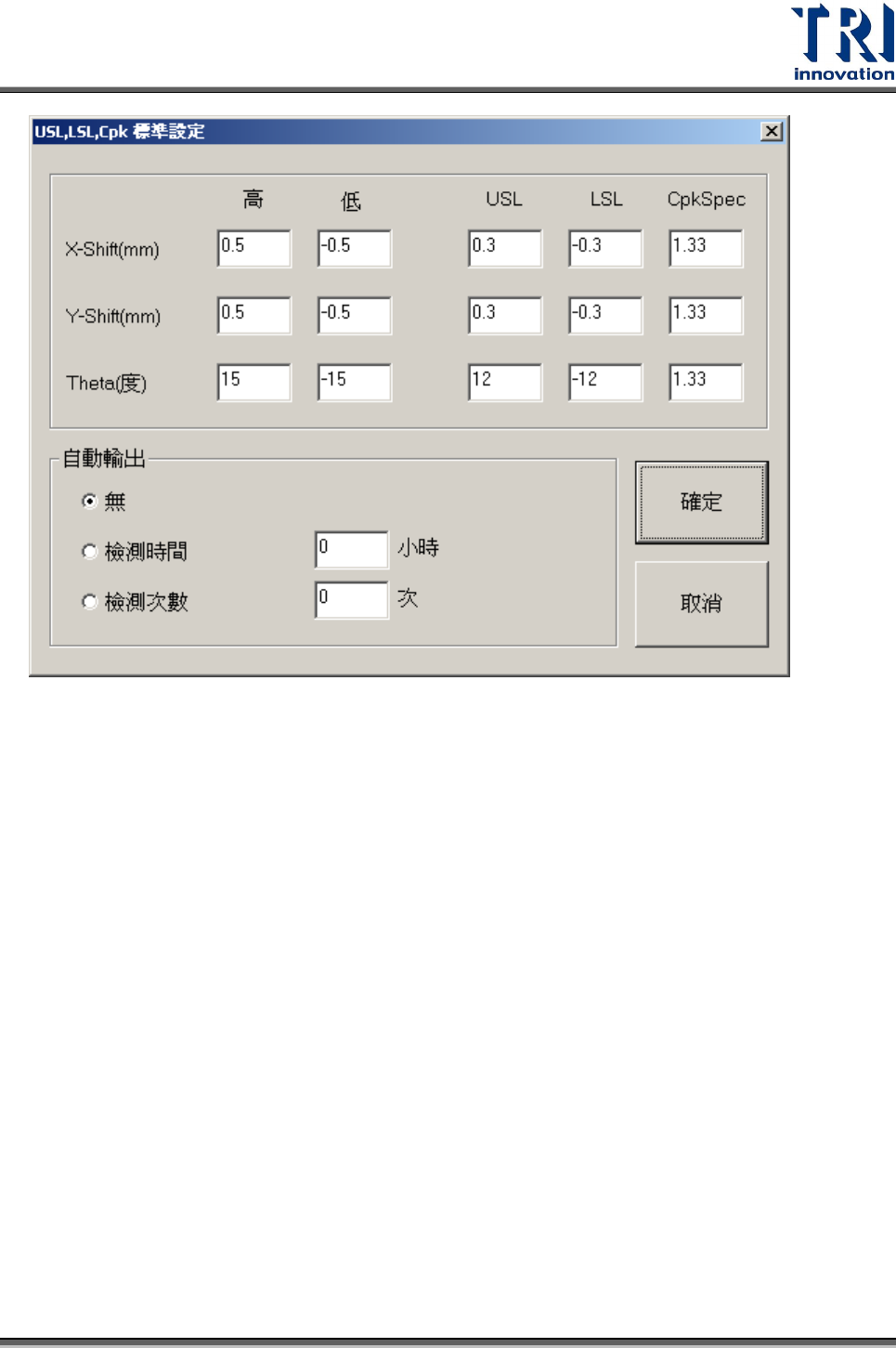 Test Research Inc. 196 TR 7700 S II User Guid e – Softwar e X-Shift 、 Y-shift 、 Theta :分別代表各元件的水平位移、垂直位移、偏移角度。 高、低 :設定位移值的上限線。位於此範圍內的檢測結果才列入 Cpk 計算。 USL :計算 Cpk 公式所需的規格上限 LSL :計算 Cpk 公式所 需的規格下限 CpkSpec :可自訂所計算出…
