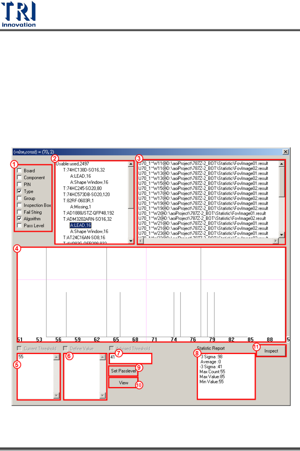 Test Research Inc. TR 7700 S II User Guid e – Softwar e 227 選擇比較的版本後,再按下 [Compare] ,在左列表中顯示了版本 3 有檢測,但版本 test 沒有檢測的元件;右列表中顯示了版本 test 有測但版本 1 沒有檢測的元件。 3.7.31 離線調整 模式 利用多片板子檢測的結果在離線機台進行資料的處理。在離線調整模式下抓取影像 時,影像將會存於以掃描時間為…