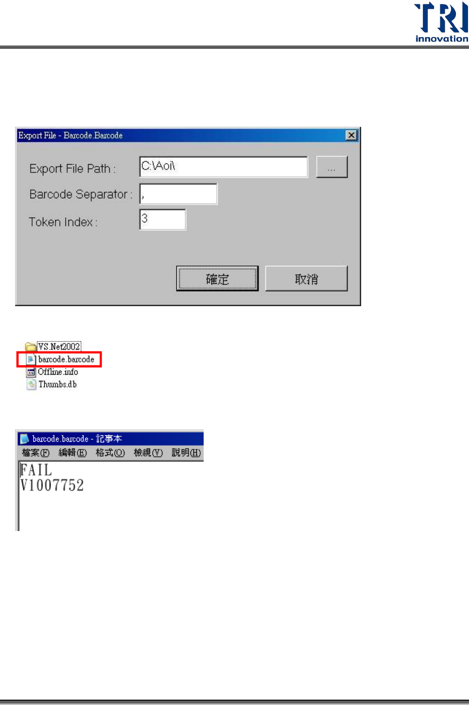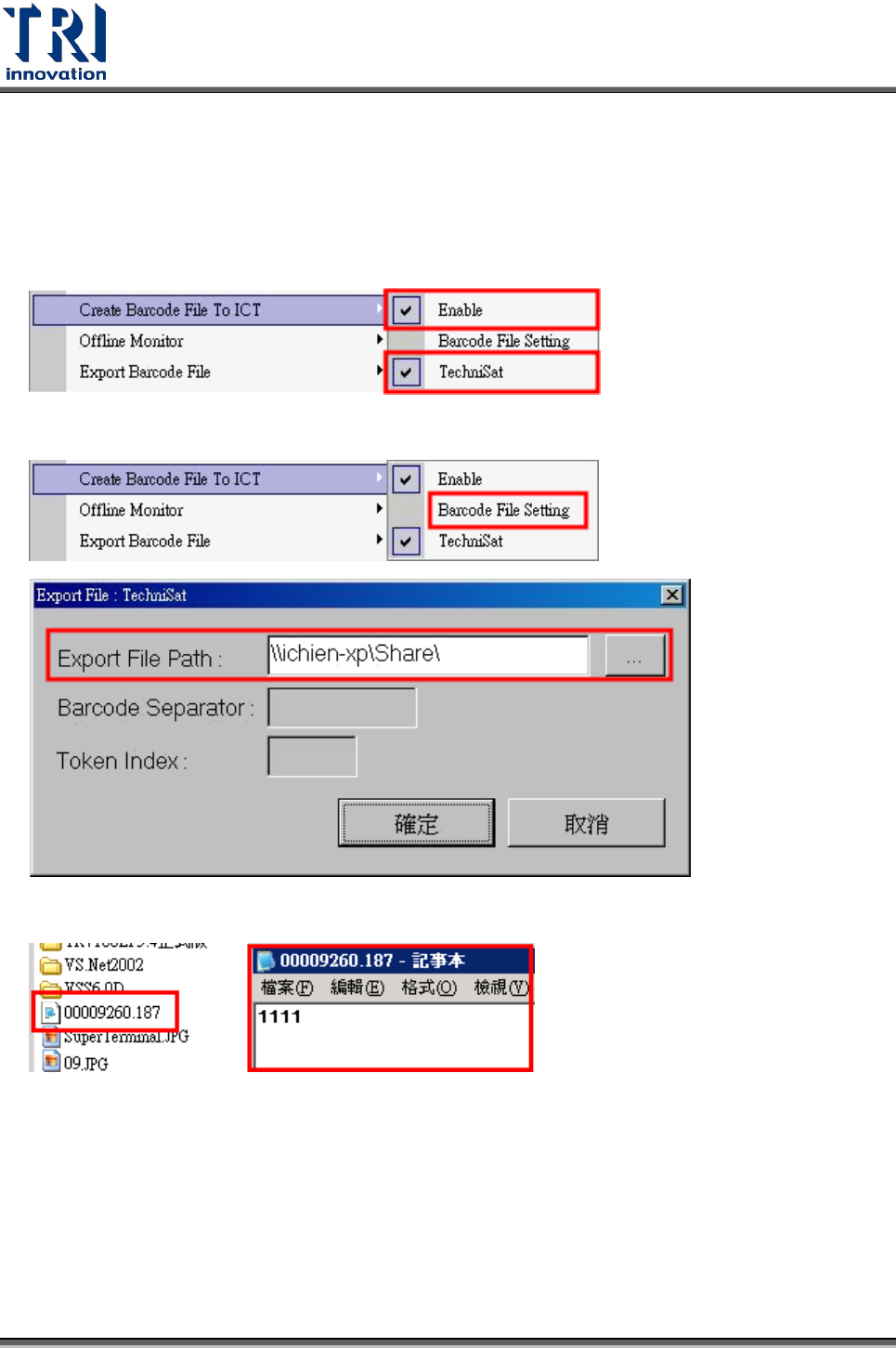 Test Research Inc. TR 7700 S II User Guid e – Softwar e 241 檔案內容為每個單板的檢測結果, 0 表示 FAIL , 1 表示 PASS 或 S KIP 。 使用說明 Step1. 啟動 [Utilities/ Create Barcode File To ICT] ,選擇 [Enable] 和 [TechniSat] 啟動 該功能。 Step2. 選擇 [Barcode…