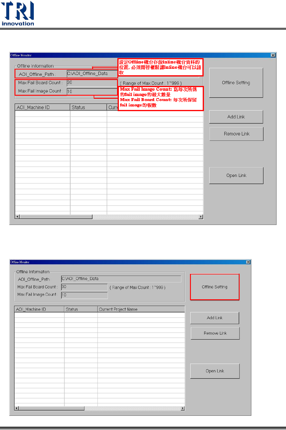 Test Research Inc. 244 TR 7700 S II User Guid e – Softwar e B. 更改 [Offline Path] 相關資訊 3. 使用者可以選擇加入一個 Inline 機台進行監控,或是刪除一個 Inline 機台。