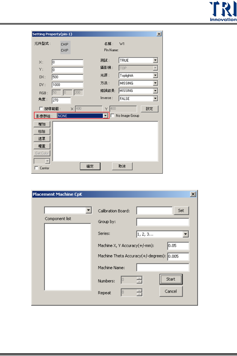 Test Research Inc. 252 TR 7700 S II User Guid e – Softwar e 2. 開啟 Cpk 輸出、統計功能 : (1) 選取 [ 工具 ] > [ 貼片機 Cp k] ,會出現以下視窗 。 (2) 先選取 T ype 。 (3) 在 Series 選擇 【 123 …】 或 【 ABC …】 。此設定會影響輸出報表名稱為 HeadA , Head1 , SpindleA 等等。 (4…