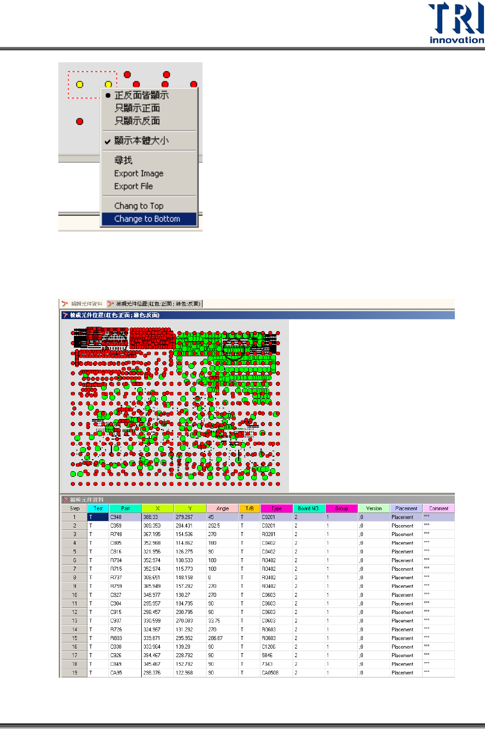 Test Research Inc. 274 TR 7700 S II User Guid e – Softwar e 為了方便找尋或對應元件位置資料,可選擇 [ 視窗 ]>{ 並排視窗 ] ,將 [ 編輯元件資 料 ] 以及 [ 檢視元件位置 ] 兩視窗並列,無論在任何一視窗中點的選元件,都會在 另一視窗中被找出其相對應的位置或資料。