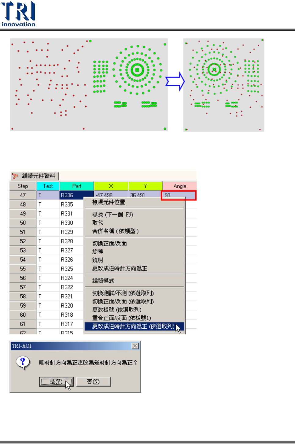 Test Research Inc. 286 TR 7700 S II User Guid e – Softwar e 4.2.12 更改板號 此功能可以手動更改特定元件所位於的連板號碼。一般而言對於多連板的電路板,建 議使用 [ 產生多連板元件資料 ] 步驟來產生多連板資料。 在 [ 更改板號 ] 視窗中輸入欲更改之板號,接著按下 [ 確定 ] 按鈕即可更改板號。 4.2.13 重合正反 面 ( 依板號 1) 本功能可將展開的 CAD…