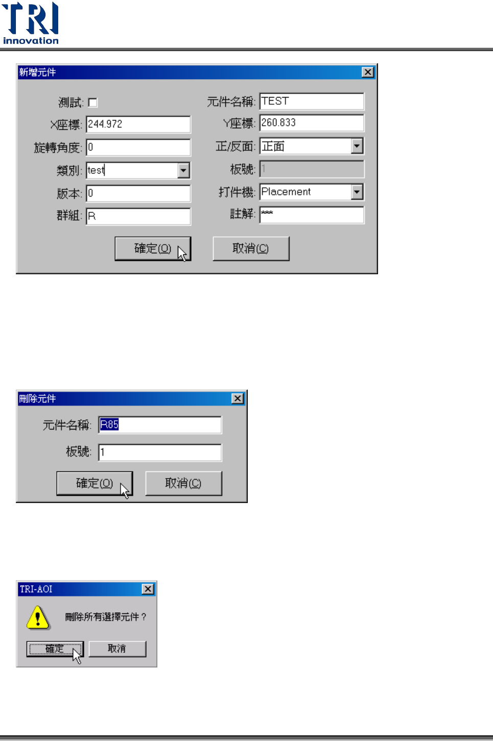 Test Research Inc. TR 7700 S II User Guid e – Softwar e 289 4.2.16 刪除元件 此功能可刪除元件資料表上的元件,可選取一個或一次選取多個刪除。 若選取刪除單個元件,則系統出現以下視窗,確認無誤後請按下 [ 確定 ] 刪除此元件。 若一次選取多個元件進行刪除動作,則系統出現以下視窗,確認無誤後請按下 [ 確定 ] 來刪除所有選取的元件。