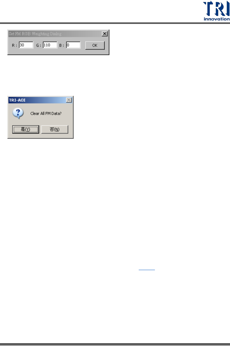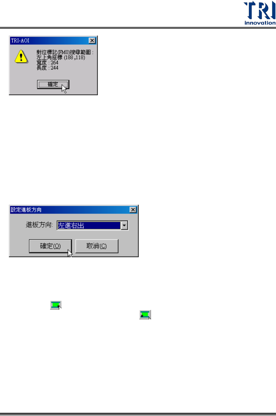 Test Research Inc. TR 7700 S II User Guid e – Softwar e 299 4.4.1.5 電路板 (1) 尺寸 (Board 1 Size) 按下此功能可以進入 [ 設定電路板 (1) 尺寸 ] 視窗,步驟請參閱 2.4.4 。 4.4.1.6 標準 FM (Standard FM) 學習標準對位標記影像功能。先調整控制框的大小及位置至標準物件上後,執行本功 能,則影像會被儲存為標準對位標記…
